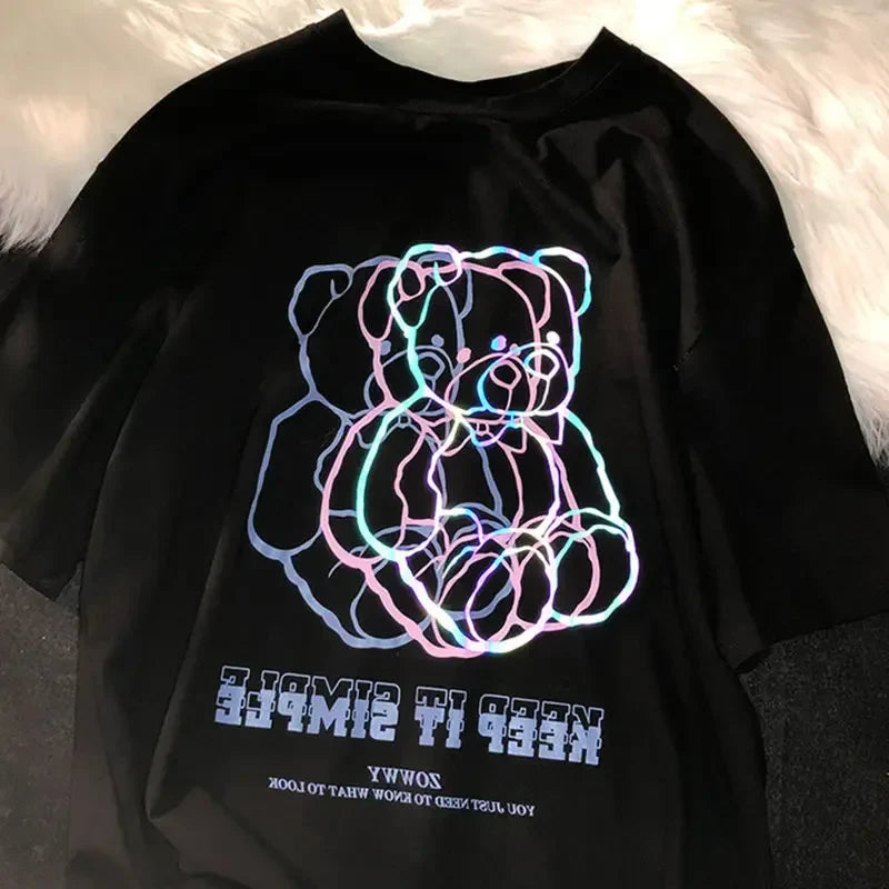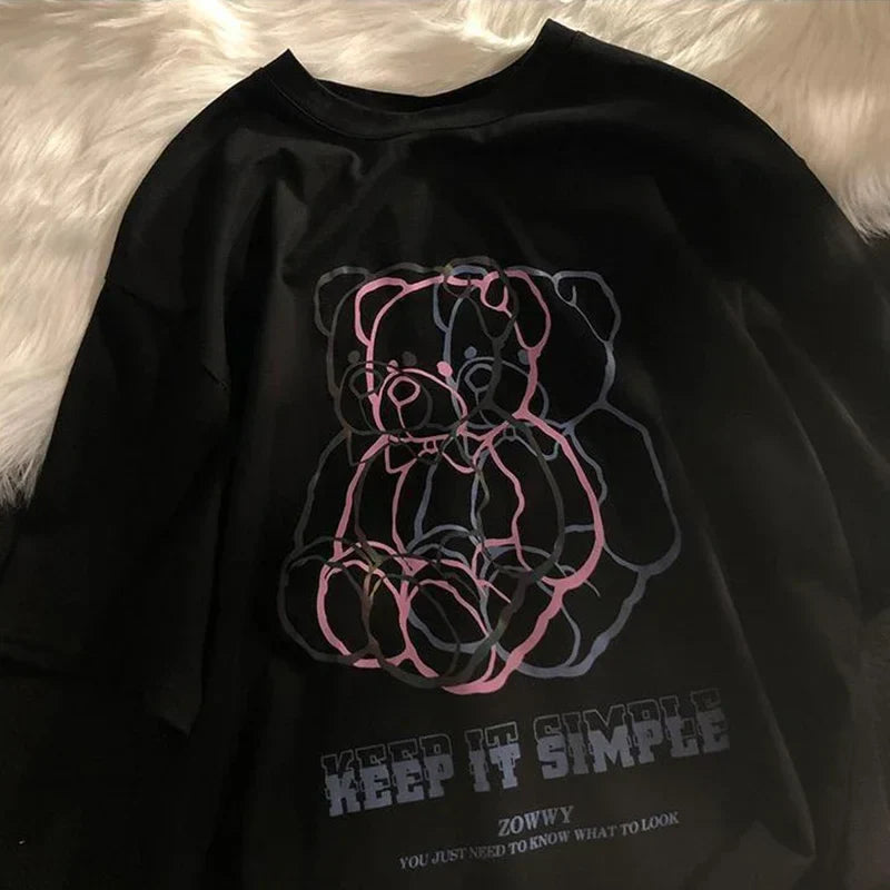 Dive into the bold world of Harajuku fashion with this unique Gothic Lolita T-shirt. This garment, enveloped in mystery and creativity, showcases an alternative aesthetic that will allow you to stand out from the crowd. The centerpiece of this T-shirt is undoubtedly the stylized print of a bear, executed in neon-colored lines that captivate the eye and invite dreamy visions of a retro-futuristic realm. Made from high-quality materials, the T-shirt combines comfort and durability with a casual cut that flatters every figure. The print offers a strong contrast to the two available colors: a deep black for a mysterious look and a pure white that highlights the vibrancy of the neon colors. Beneath the bear print, you will find inverted text that enhances the unique and avant-garde character of the garment, emphasizing your affiliation with the Lolita Gothic subculture.