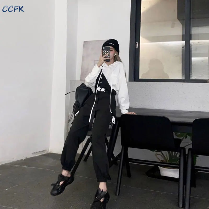 Immerse yourself in the heart of urban style with our Techwear cargo pants for women, inspired by the Harajuku streetwear scene. A must-have for anyone daring to emphasize their character with boldness and originality. These black, high-waisted pants are the ideal garment for those who love alternative fashion. They are made from durable fabric and feature a comfortable, versatile cut, highlighted by authentic details from white contrast straps and patch pockets with practical zippers. The aesthetic is accentuated by trendy patches and an adjustable belt that emphasizes the silhouette. Whether for a city outing or a night out with friends, these cargo pants guarantee you an avant-garde and impactful look. They promise not only to keep you stylish throughout the seasons but also offer you a variety of looks ranging from casual grunge to edgy chic. Pair them with a patterned top for a strong contrast or with monochromatic accessories for a harmonious overall appearance.