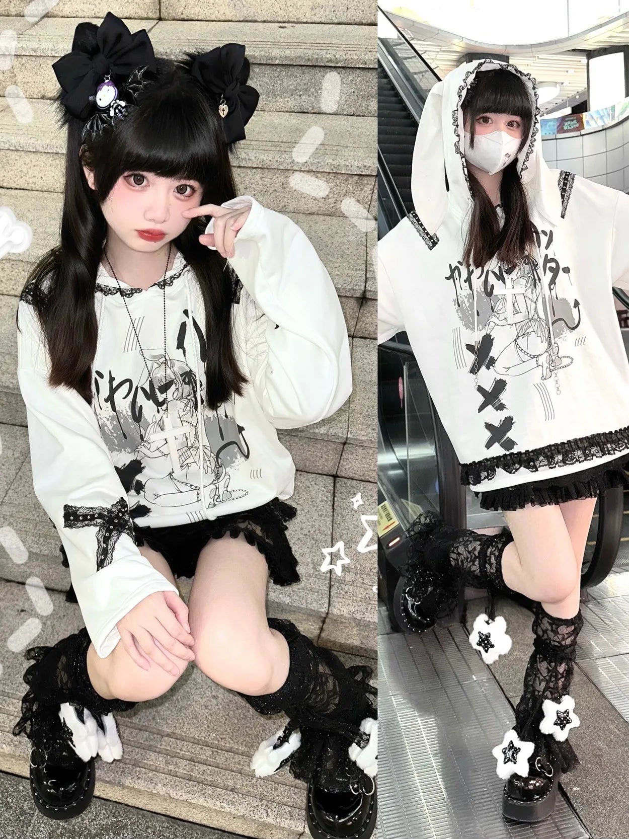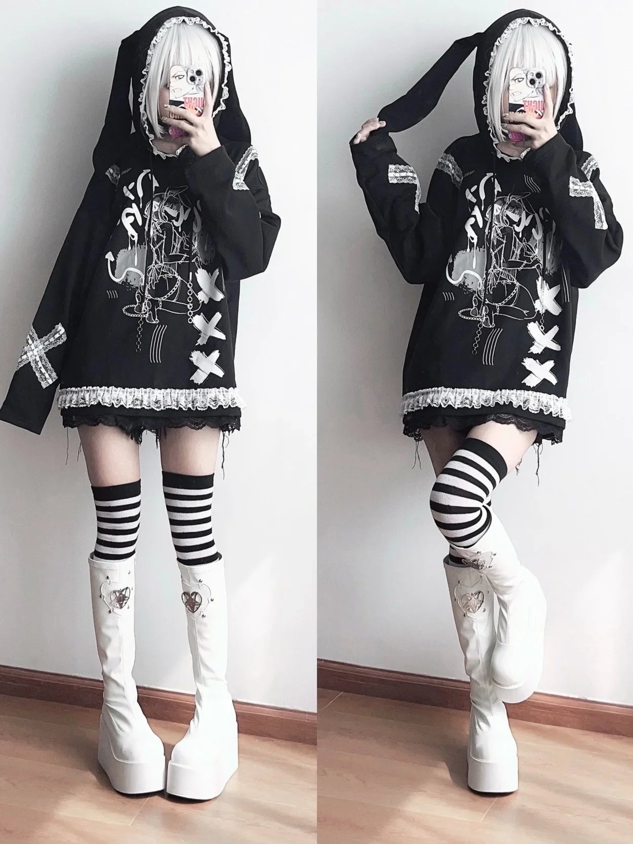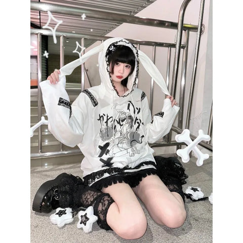 Discover our unique Japanese hoodie that combines alternative fashion and kawaii aesthetics with a bold touch. This lightweight garment made of soft cotton is comfortable to wear and accentuates your style. The eye-catching design of the sweatshirt features a black cartoon-style rabbit, accompanied by eccentric graphic patterns that are sure to turn heads. Lace details at the hem add a feminine touch, while the spacious hood and long sleeves provide cozy warmth on cooler days. This versatile sweatshirt is available in black and white and pairs perfectly with flowing skirts or leggings. Showcase your originality and passion for Japanese culture with this must-have piece. With this hoodie, which will excite all lovers of alternative fashion, dare to be unique and comfortable while capturing the spirit of the times!