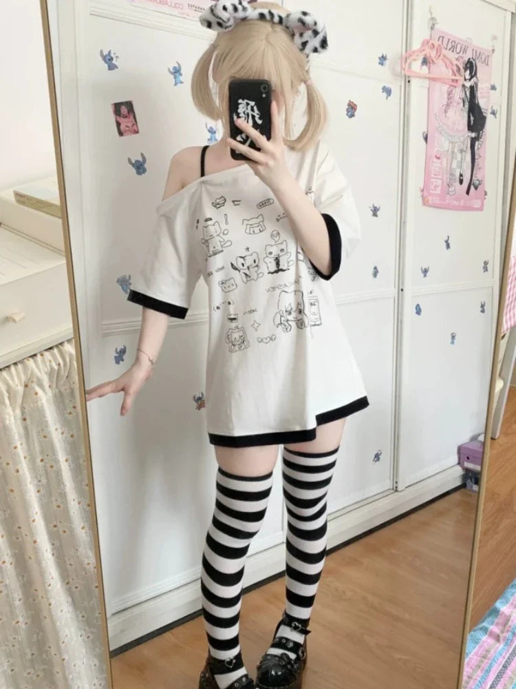Embrace a unique style with this Harajuku patchwork T-shirt, perfect for lovers of alternative fashion. Made from soft, comfortable cotton, this loose-fitting piece provides a casual look that's still chic. The playful pattern features prints of cute characters in Japanese Kawaii style, reminiscent of softness and originality. The black details on the sleeves create a contrast that highlights the creativity of this piece. Whether you wear it with striped leggings or a light skirt, this T-shirt is perfect for expressing your bold personality. Make a statement at any occasion, whether it's a get-together with friends or a music festival. Get swept away by the charm of Japanese fashion and add this one-of-a-kind T-shirt to your alternative wardrobe!