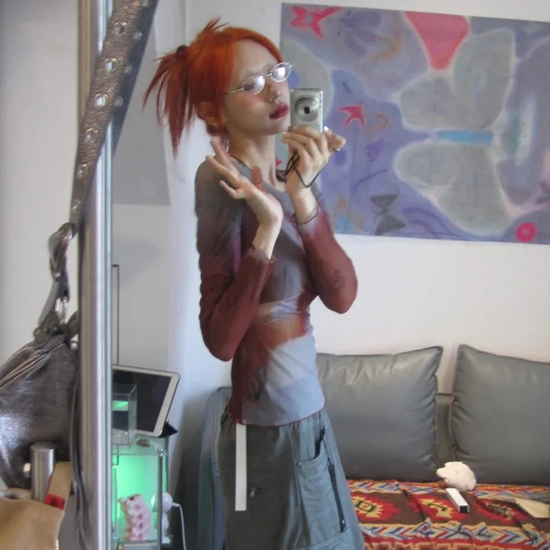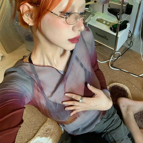 Dive into the nostalgia of the millennium with this transparent mesh top that is plucked straight from the creative bloom of the 2000s. Express your individuality with this daring piece that perfectly embodies the flirty spirit of Y2K. The simple silhouette is combined with a refined color palette, where burgundy tones transition into an urban gray, creating a distinctly avant-garde look. This top, made of delicate fabric, fits like a second skin and invites playful layering. Wear it with a solid-colored camisole for a subtle daytime look, or dare to contrast it under an oversized blazer for a subtly bold evening outfit.