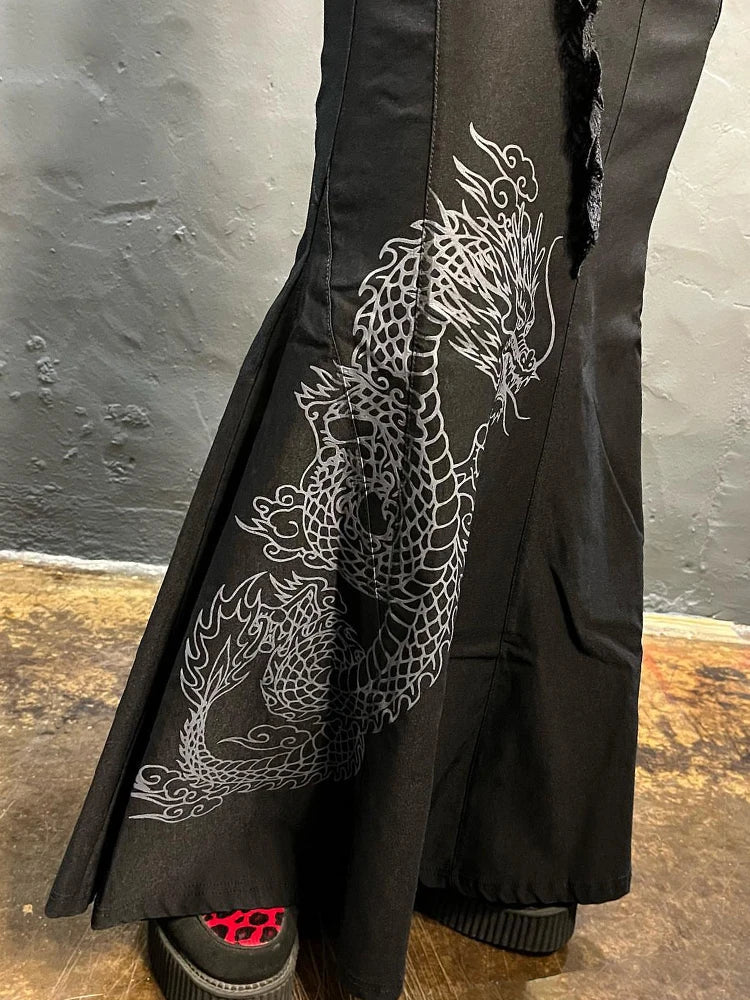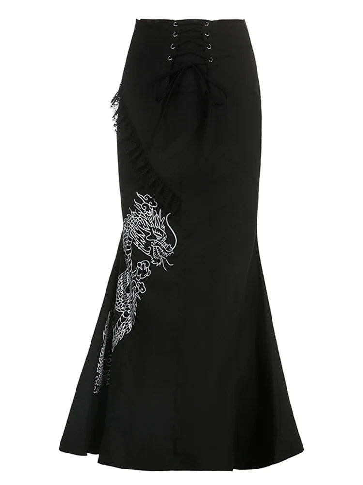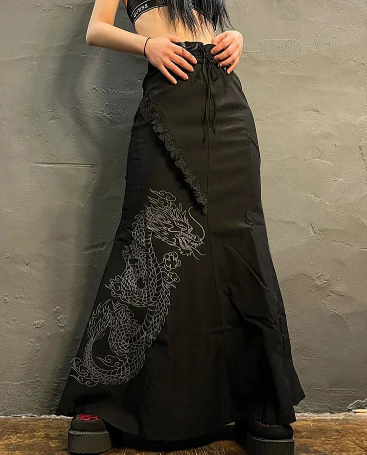Discover our A-Line maxi skirt in black featuring a striking dragon print that blends elegance and boldness. The skirt is made from a lightweight, breathable fabric, making it perfect for alternative looks that won't go unnoticed. The lace detail on the side gives the skirt a feminine touch while still staying true to the alternative style. The dragon print, an emblem of power and mystery, makes this piece a must-have for anyone looking to express their individuality. Whether you pair it with a daring crop top or a graphic t-shirt, this skirt is a true fashion statement that will elevate your wardrobe. With this unique skirt, designed for those who aren't afraid to stand out from the crowd, you can embody a free spirit. It's perfect for festivals, evenings with friends, or even a relaxed brunch, being as versatile as it is elegant. Don't wait any longer and add this essential piece to your collection!