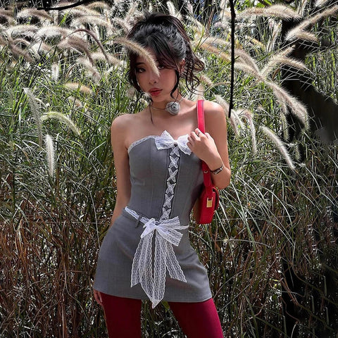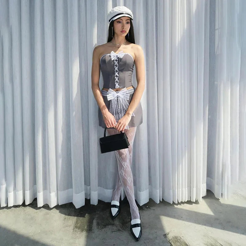 Let yourself be seduced by this two-piece ensemble, where the sensuality of alternative fashion meets an undeniably feminine style. The top, a sleeveless bandeau, flatters the figure with its front lacing, reminiscent of classic Victorian corsets. It is made from a gray fabric that promises absolute wearing comfort and is adorned with white lace, providing a soft and refined touch. The skirt, embodying the boldness of this ensemble, is mini and captivating. It is decorated with the same white lace that gently embellishes the waist with a gracefully placed bow. Combined with the top, it creates a harmonious and fascinating outfit that stylishly expresses your individuality. This simple yet complex ensemble suggests an unparalleled freedom thanks to its bandeau cut, which leaves the shoulders bare, and its skirt, which gently accentuates the curves without adhering to conventions.