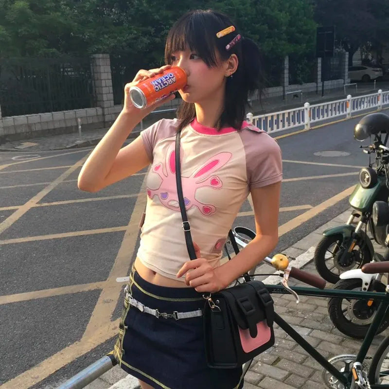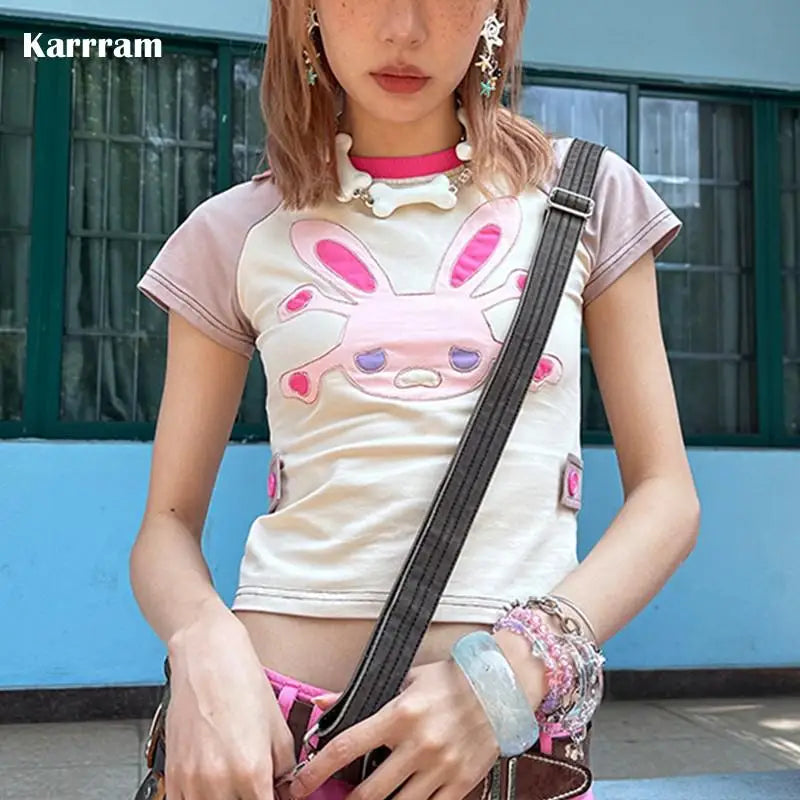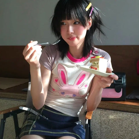 Fairycore Patchwork T-Shirt with Japanese Bunny Print