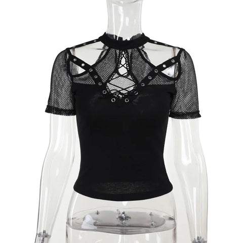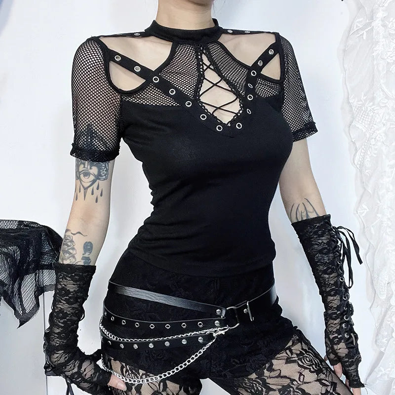 Discover the perfect compromise between boldness and gothic style with our mesh T-shirt! The quirky black color and the body-hugging, sexy, and potential hit cut add a touch of modern mystery to your black gothic look. This gothic T-shirt is primarily made from soft cotton and features a striking design that stands out from the crowd. The top made of black, opaque mesh seduces just as much as it transforms, resting on the shoulders and showcasing modernity.