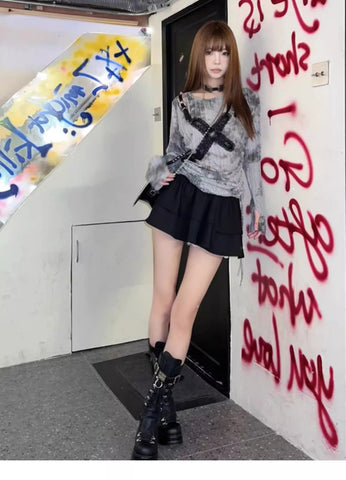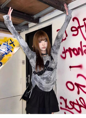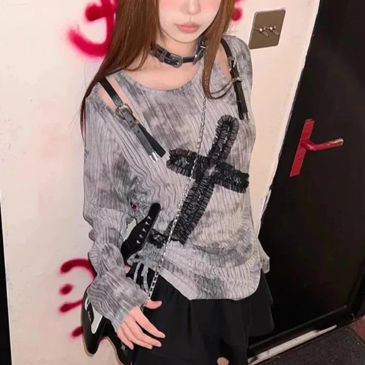 With our Gothic Off Shoulder T-Shirt, a must-have that combines attitude and elegance, you can fully express your bold side. This long-sleeved top features a unique tie-dye design and is perfect for anyone daring enough to stand out from the crowd. The elegantly unstructured T-shirt is adorned with a stylish cross and lace details, adding a rebellious touch to your outfit. The slender straps leave the shoulders bare, allowing you to play with various styles while staying trendy. This top is designed for lovers of alternative and Y2K fashion, adding a bold dimension to any wardrobe. Pair it with a black skirt and boots for a look that turns heads. Whether at a concert or on a outing with friends, this T-shirt is your new ally for expressing your unique personality. Put it on and be ready to impress!