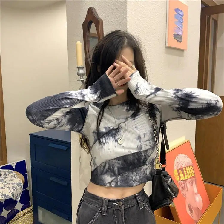 Tie Dye Asymmetrical Patchwork Long Sleeve T-Shirt for Women