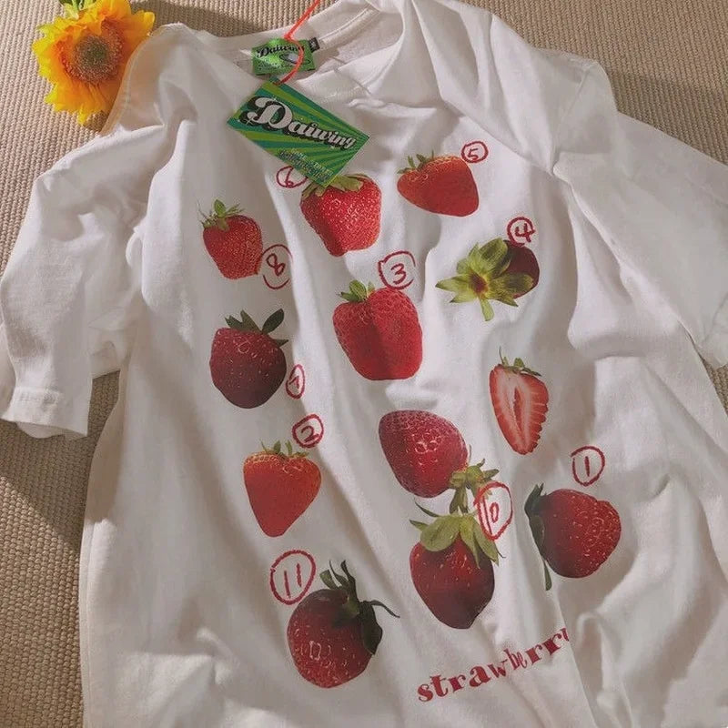 Women's T-Shirt with Strawberry Print in Aesthetic Cartoon Style