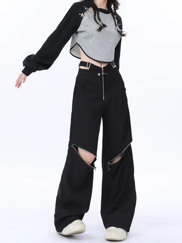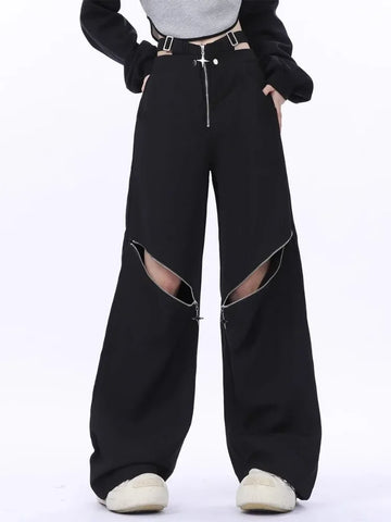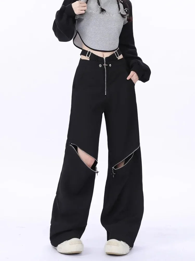 Black Y2K Cargo Pants for Women Wide Cut with Zipper Detail