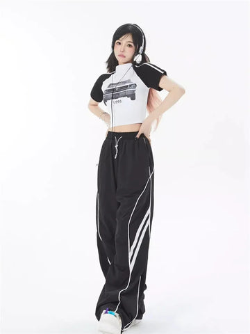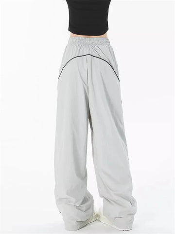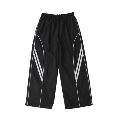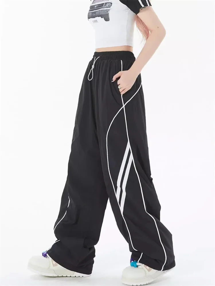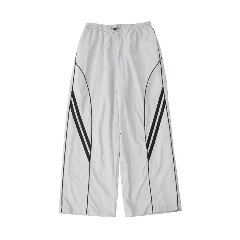 Dive into the past with these gray, flared joggers for women, inspired by the Y2K aesthetic and Egirl trend. Their vintage design with contrasting black stripes recalls the fashion icons of the 2000s. These joggers are made from a soft, comfortable fabric, ensuring optimal wearability while catapulting you into the heart of the retro-modern trend. The cut is casual and oversized, perfect for anyone who wants to combine comfort and style. The elastic waistband provides a perfect fit at your waist, while the soft texture of the fabric offers unparalleled freedom of movement. The black side stripes add a dynamic and stylish touch to these casual pants. Whether you pair them with a graphic crop top and sneakers for a daytime look or dress them up with a fancier top for an evening with friends, these flared joggers are a must-have for your alternative wardrobe. Add a pair of oversized sunglasses and