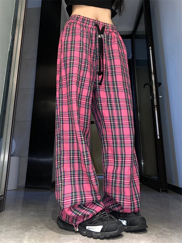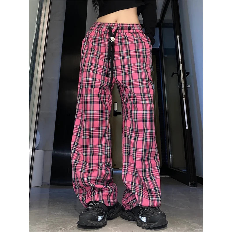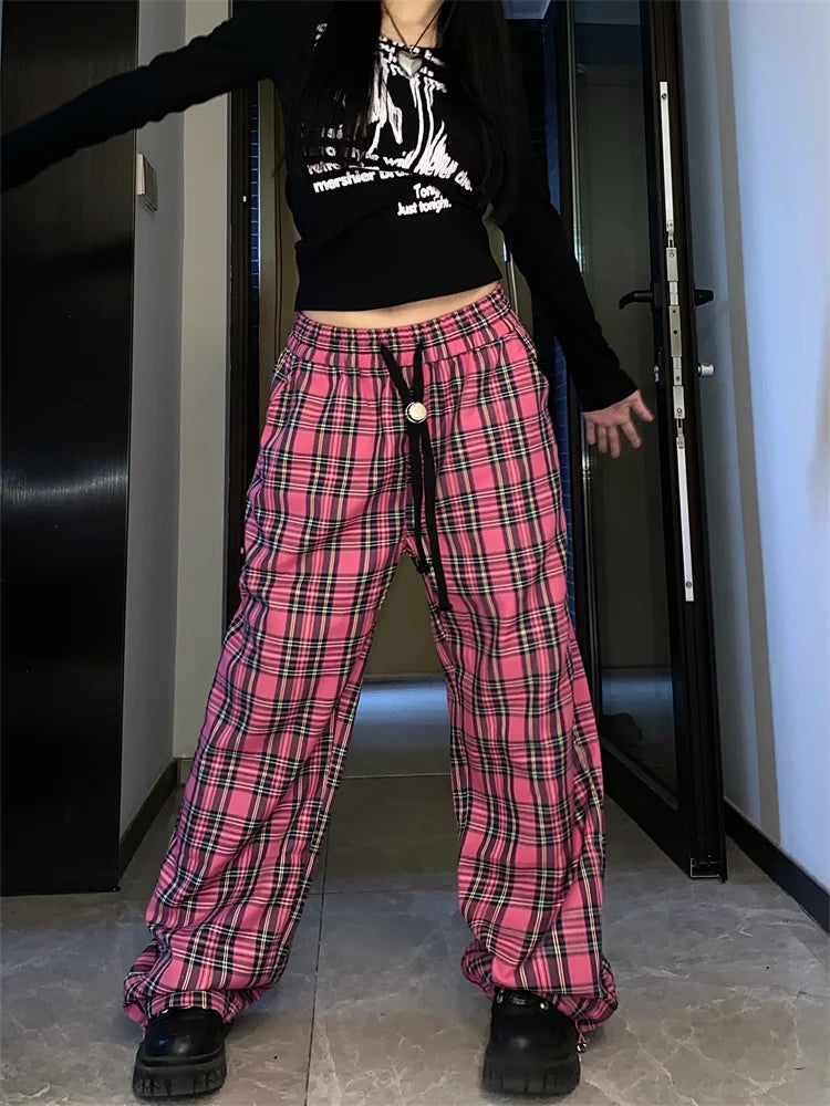 Dive into the nostalgia of the early 2000s with our pink checked pants. They are the perfect choice for any e-girl fashionista and Y2K style enthusiast. These wide plaid pants not only offer exceptional comfort thanks to their oversized fit but also add a bold touch to your wardrobe with their eye-catching design. These pants are made from high-quality fabric, feel soft to the touch, and are designed for durability. The elastic waistband ensures a perfect and comfortable fit, and the black drawstring detail adds a rebellious touch that captures the essence of alternative fashion. With their generous, practical pockets, these pants will not leave you untouched. Pair them with chunky sneakers for an authentic 2000s look or add high heels for a sharper style. Whether it's a night out with friends or a concert visit, these checked pants are the ultimate expression of an era when fashion was bold. Dare to wear them and make a statement in