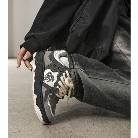 Transform your look with the Chunky Athletic Sneakers, which are a perfect blend of comfort and bold style. These unisex shoes, available in gray and black, capture the spirit of the 2000s with a contemporary touch and are ideal for anyone looking to stand out from the crowd. The sneakers are made from a high-quality mix of materials and feature a sturdy yet chic design. The elegant gray upper is enhanced by black details and a striking pattern that draws attention. The platform sole ensures optimal wearing comfort, while the cotton laces add a casual and authentic touch. Whether you're heading out with friends, having a shopping day, or simply wearing them to add style to your daily routine, these shoes are the perfect choice for anyone who loves alternative fashion. Complete your outfit with these sneakers that combine vintage aesthetics with modern functionality. Don't wait any longer to affirm your unique identity!