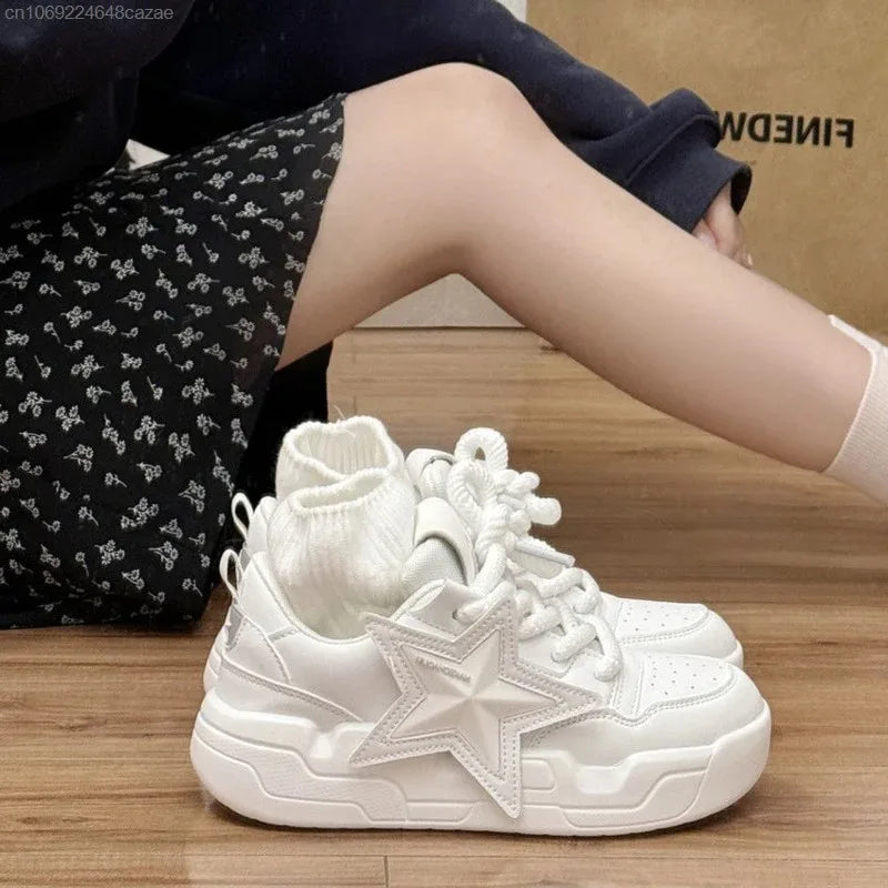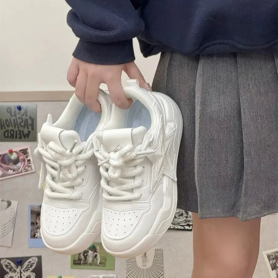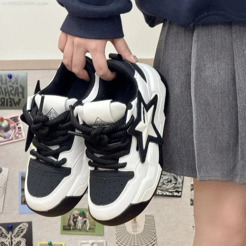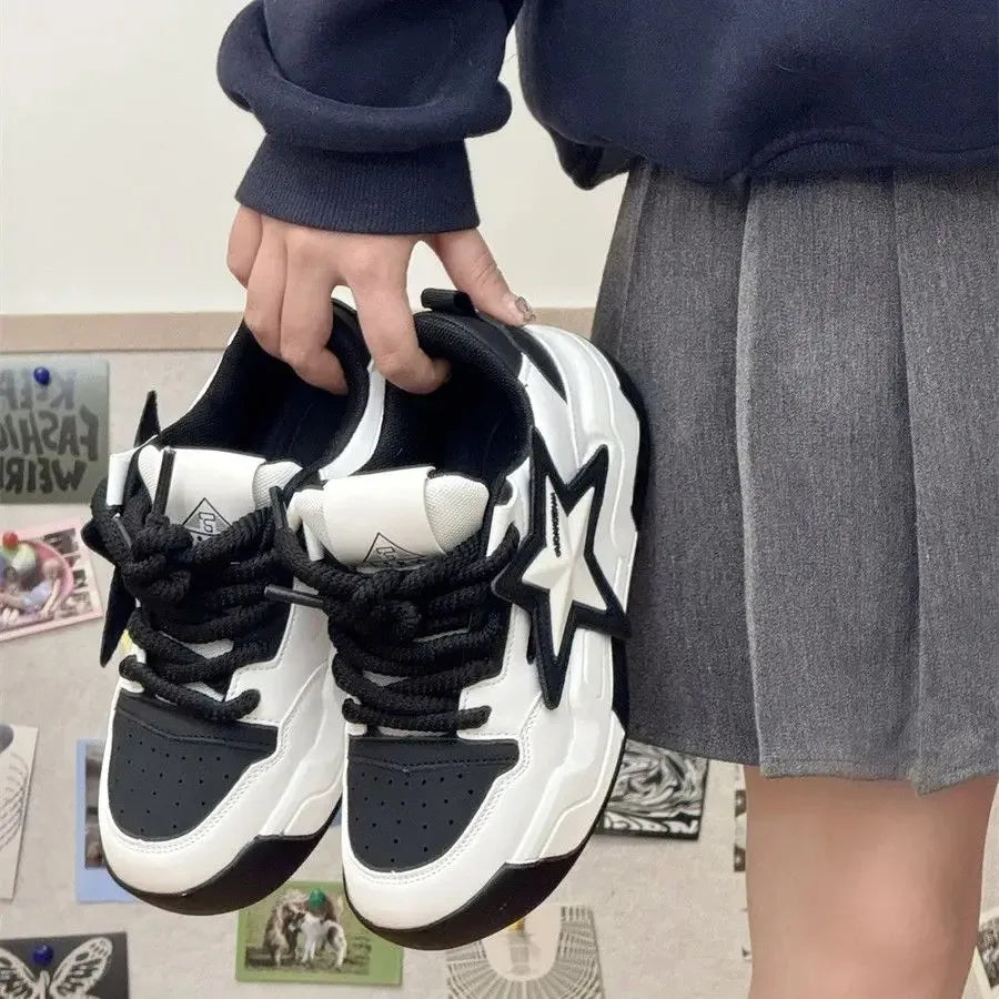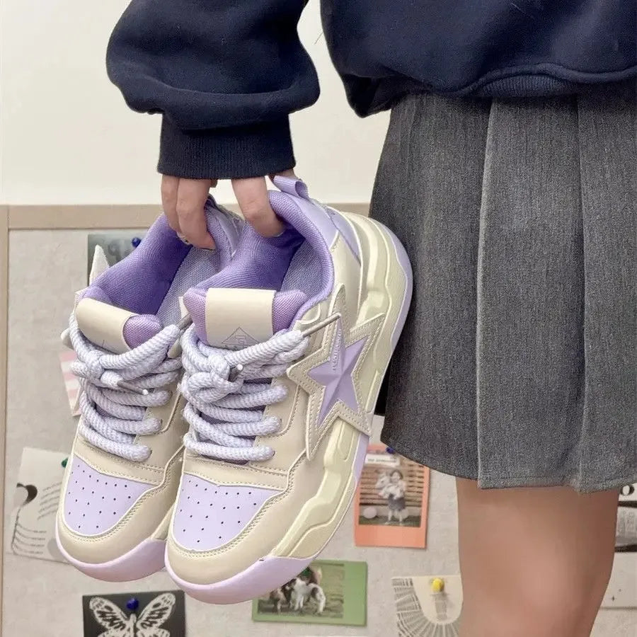Discover the perfect blend of comfort and alternative style with our Aesthetic Sports Shoes Star. Designed for the trendsetters of the new millennium, these sneakers combine elegant design and functionality, making them a must-have for your wardrobe. The soft cream color with purple details is a real eye-catcher and provides a casual look. The chunky silhouette appears cheeky and modern, while the braided straps and laces ensure optimal support throughout the day. Whether for a trip with friends or a relaxed session, these shoes pair perfectly with joggers or skirts, adding a unique touch to your look. Take the opportunity to stand out from the crowd and make a bold fashion statement. With the aesthetic shoes from Étoile, you are the star of your own adventure!