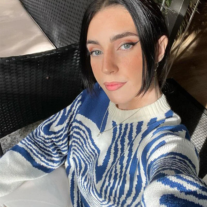 Dive into the vibrant world of the 2000s with our knit sweater featuring a hypnotic pattern. Made from a high-quality blend of materials, this sweater combines comfort with a cheeky style. With its retro design and colors of Deep Navy and Cream, it's a real eye-catcher, whether you're going out with friends or relaxing at home. The loose, casual fit allows for plenty of freedom of movement and is perfect for expressing your uniqueness. Pair it with baggy pants or a leather skirt for a standout look. This sweater not only warms your body but also elevates your style to a new level. Show your passion for alternative fashion with this essential garment that reminds of the free and creative spirit of past streetwear.
