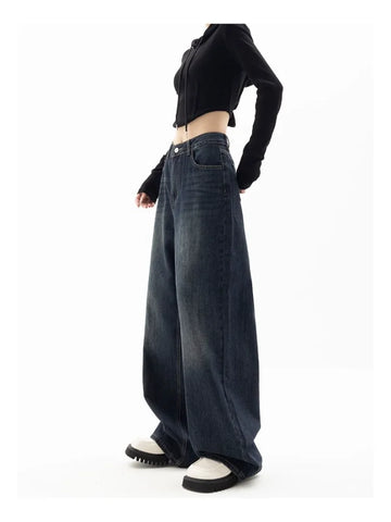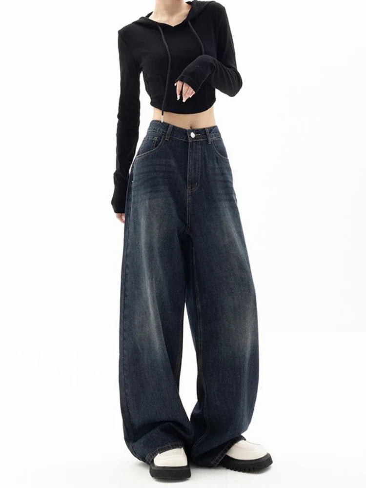 Wide Women's Baggy Jeans in Denim Oversized Korean Fashion Dark Blue