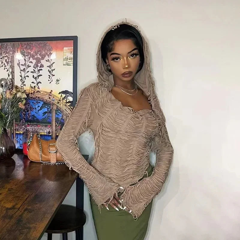 Awaken your style with our vibrant fringe camisole - a must-have for all alternative fashion lovers! This elegantly designed hooded top combines comfort and daring. Made from a blend of soft, stretchy fabrics, it hugs your curves while providing unparalleled freedom of movement. The especially trendy fringe design adds a dynamic touch to your silhouette, while the hood creates a mysterious, urban look. Perfect for a casual yet stylish look, this top pairs wonderfully with your favorite denim shorts or even a leather skirt for a strong contrast. Showcase your individuality with this top that allows you to express your true self, whether at a music festival or on a trip to the city. This fringe top is a mix of comfort, elegance, and creativity, ready to become one of your new fashion essentials. Add it to your wardrobe and be prepared to turn heads!