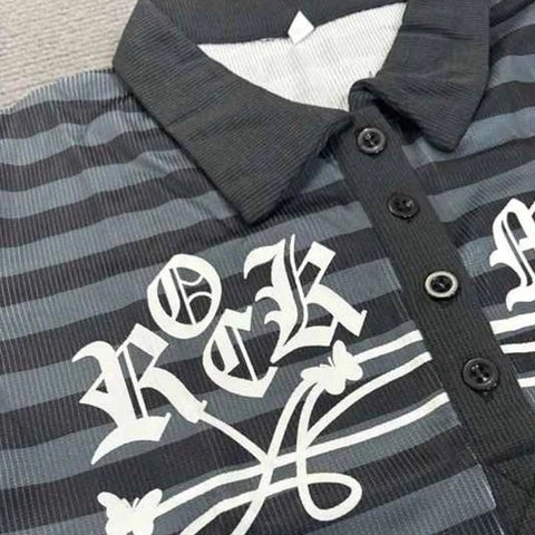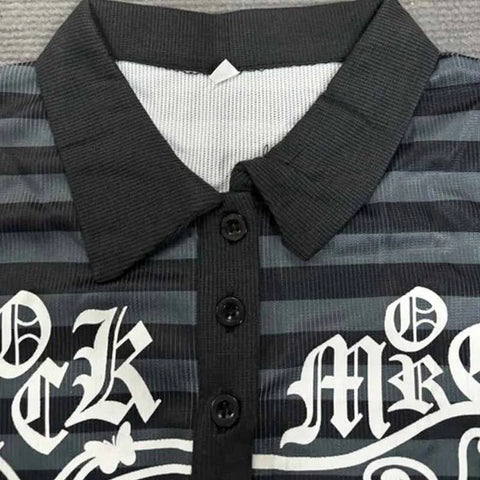 Entdecken Sie unser gestreiftes T-Shirt Y2K, eine perfekte Verschmelzung von Dark Academia-Stil und Techwear. Dieses Oberteil mit Dreiviertelärmeln besteht aus einem leichten, bequemen Stoff und hat ein dunkles Streifenmuster, das eine geheimnisvolle und raffinierte Stimmung hervorruft. Sein taillierter Schnitt passt sich elegant der Silhouette an und bietet gleichzeitig Bewegungsfreiheit. Der V-Ausschnitt und die Knöpfe sorgen für einen subtilen Touch, während die grafischen Details ein gewagtes Statement für Liebhaber alternativer Mode setzen. Ob Sie es mit einer Kunstlederleggings oder einem Faltenrock tragen, dieses T-Shirt ist ein wesentlicher Bestandteil Ihrer Garderobe, um Ihren einzigartigen Stil zu unterstreichen. Umarmen Sie den Charme von Y2K und lassen Sie Ihre Persönlichkeit mit jedem Detail glänzen!