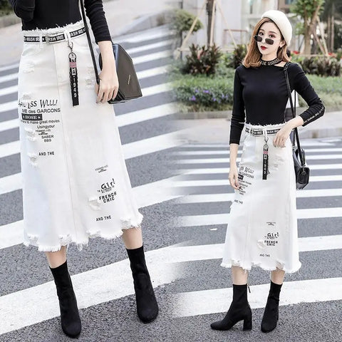 Discover our Japanese denim skirt, a true must-have for fashionistas who love to stylishly stand out from the crowd! This skirt made of high-quality denim features a unique and daring design that perfectly matches your alternative personality. The casual look is accentuated by artistic rips and patchwork details that provide a modern and original touch. The graphic prints on the fabric, inspired by urban culture, are the detail that makes the difference and gives you the opportunity to combine comfort with creativity. With its long, flowing cut, this skirt adapts to any figure and can be worn with your favorite boots or sneakers for a casual, urban look. Whether you're going out with friends or spending a day at the office, this versatile piece can handle it all! Pair it with a black top and wear metal jewelry to create a chic and original look. Don't miss the chance to refresh your wardrobe with this skirt that combines alternative style with comfort.