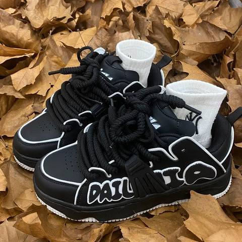 Embark on a journey through Y2K trends with these black retro sneakers that combine comfort with bold style. These platform sneakers are designed for creative minds and feature a unique design with stylized letters that add a personal touch to every step. They are made from breathable materials that ensure optimal ventilation, allowing you to feel comfortable all day long. Their thick sole provides not only extra support but also catapults you to new heights of style. Whether in the city or on a trip with friends, these sneakers are the perfect choice to complete your alternative look. Don’t miss the opportunity to highlight your daring side. Choose the Retro Black Sneakers with Letter Print and let your style speak for itself!