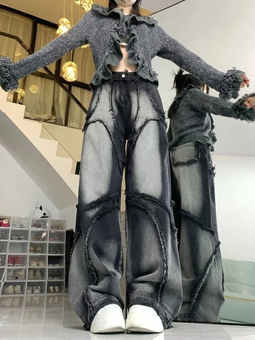 Y2K Women's Wide Leg Jeans Black and Grey Patchwork High Waist