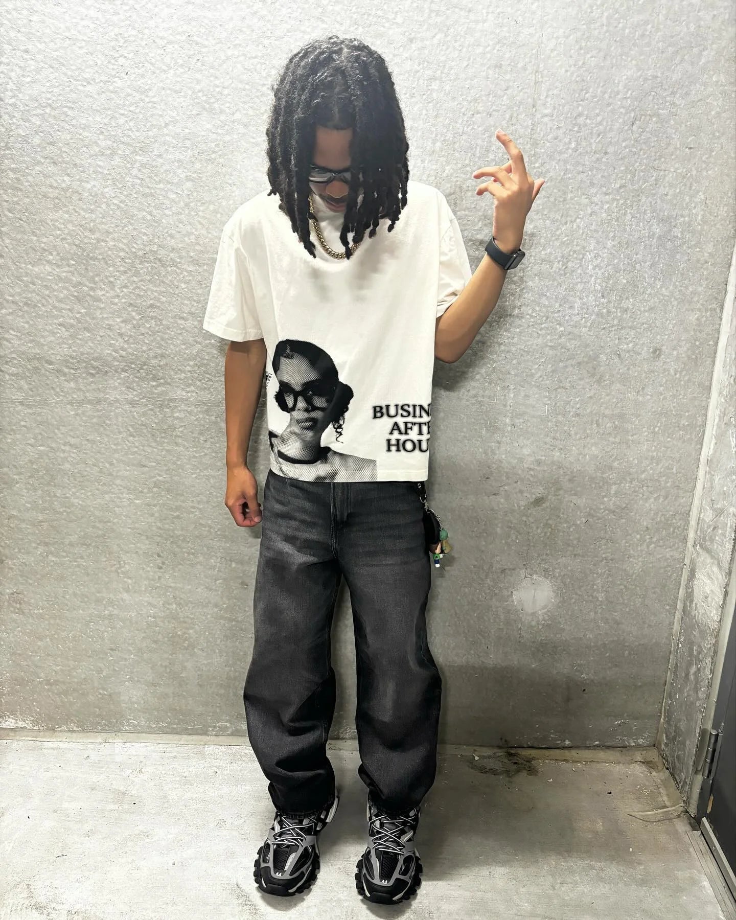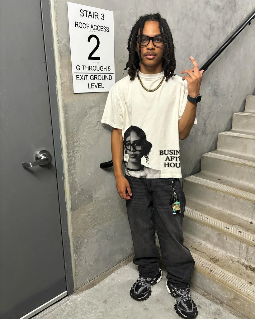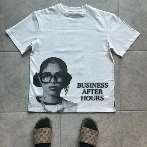 Dive into the cheeky world of alternative fashion with our Oversized T-Shirt with Hip Hop Character Print Y2K for Women. This iconic T-shirt made from soft, comfortable cotton combines comfort and casual style. Featuring the captivating print of a Hip-Hop icon with large glasses and the bold lettering "BUSINESS AFTER HOURS," this T-shirt is sure to attract admiring glances. Whether out with friends or enjoying a relaxed evening, it adds a unique touch to your wardrobe. The oversized fit offers plenty of freedom of movement, while the solid color design provides a chic vintage look. Paired with leather pants or a denim skirt, the T-shirt is a real eye-catcher. Express your personality and alternative style with this T-shirt!