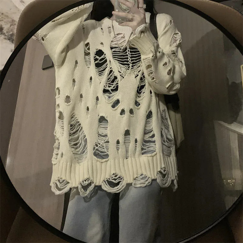 Y2K Knit Sweater with Hole Pattern for Women - Casual Plus-Size Knit Sweater in Grunge Style for a Unique Outfit.