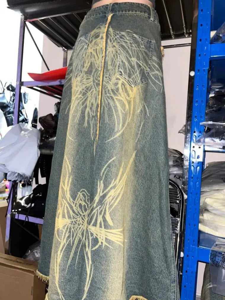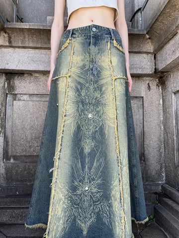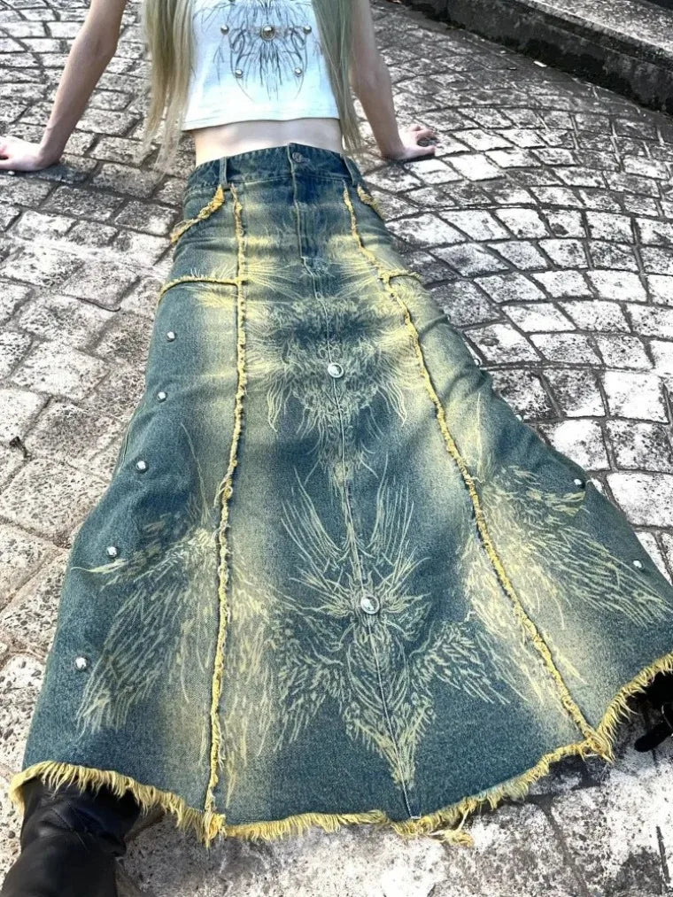 Discover the rebellious charm of reinvented denim with this oversized denim skirt that captures the spirit of alternative Y2K fashion. This piece is designed for the woman who dares to stand out from the crowd and is the perfect blend of vintage style and avant-garde character. This A-line skirt made from durable denim with a washed effect gains a touch of authenticity through the worn-out details and frayed edges. The highlight is undoubtedly the striking print, inspired by a retro aesthetic, showcasing intricate patterns that seem to tell a mystical story woven into the fabric itself. Delicately applied pearls add a dimension of texture and shine, complementing the print with a touch of casual sophistication. The silver buttons running down the front of the skirt are not only for shape - they are functional and add a striking design element.