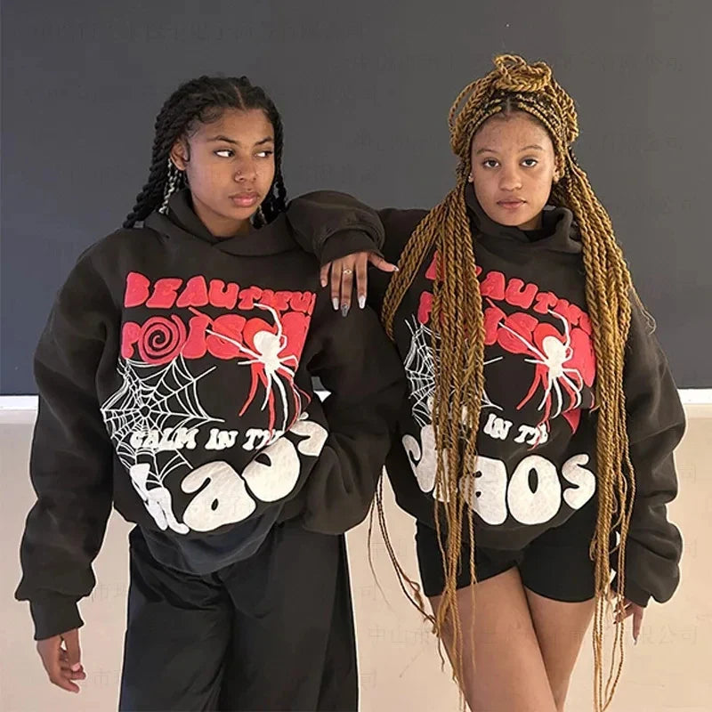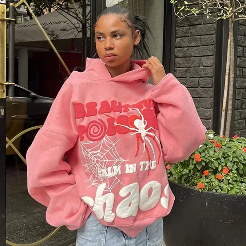 Immerse yourself in the alternative world with our Y2K Punk Hoodie - a must-have for any daring wardrobe. This sweatshirt is designed for women who love the beauty of chaos. It shines in a delicate pink, accented by exciting patterns like spiders and cheeky slogans. The soft and comfortable material is perfect for a relaxed day or an evening with friends. Whether paired with ripped jeans or a leather skirt, this hoodie adds a unique and modern touch to your style. Let yourself be inspired by this garment that combines comfort with style and expresses your personality unapologetically.