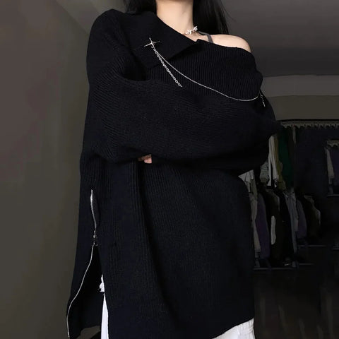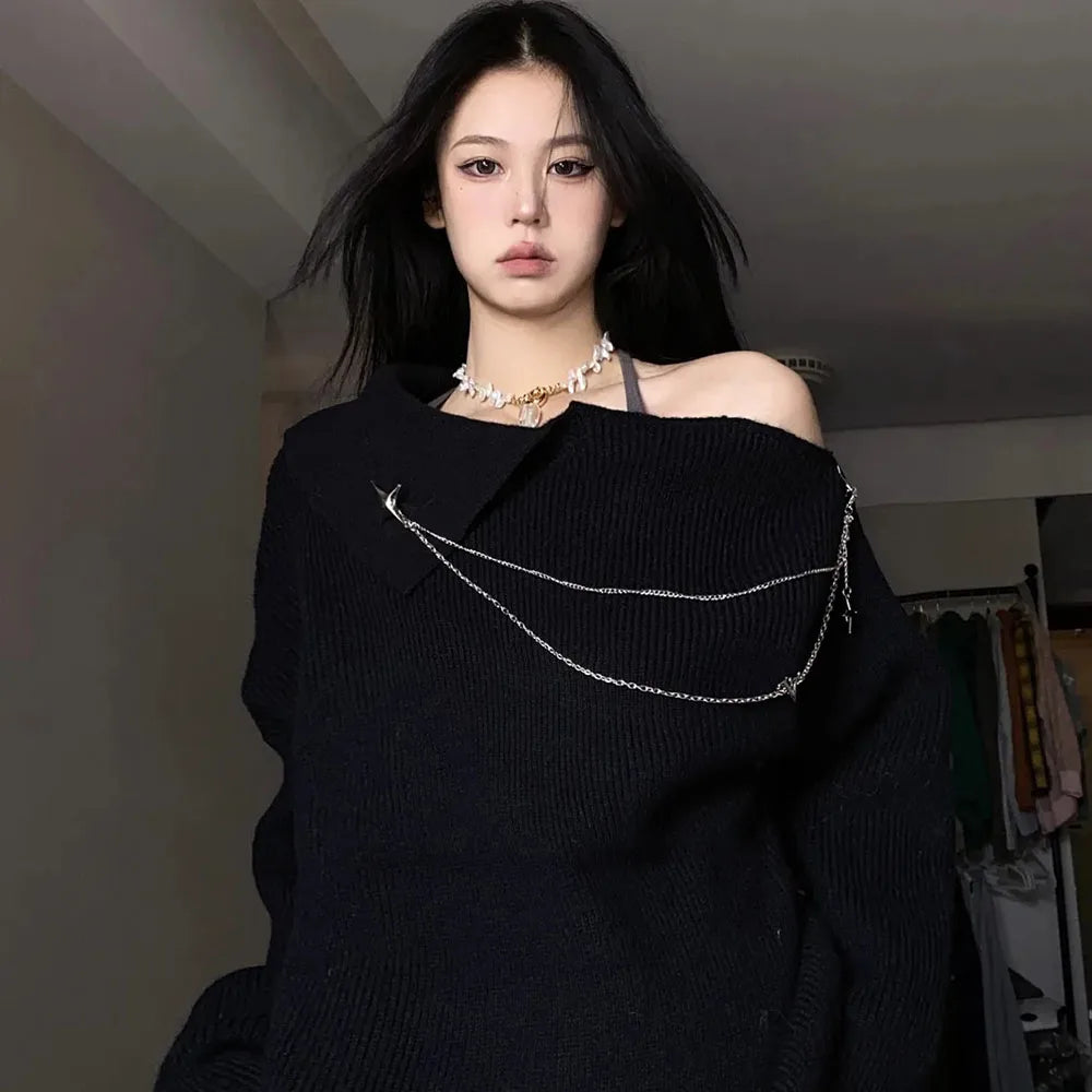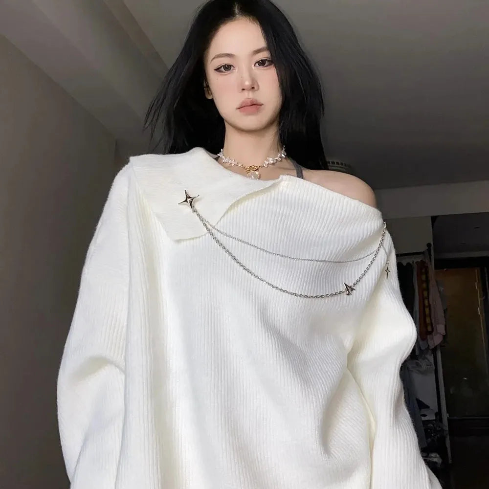 The Y2K White Star Chain Pullover is the perfect embodiment of an alternative and bold style. This sexy pullover features a beautiful asymmetrical design that highlights a bare shoulder and is adorned with sparkling star chains. It is made from soft and comfortable material, offering not only a unique look but also a pleasant wearing experience throughout the day. With its long sleeves and casual cut, this pullover is ideal for anyone looking to stand out while staying comfortable. It is suitable for both a modern daytime look and a trendy evening outfit. Paired with jeans or a leather skirt, it creates a fantastic combination. Show off your style with this essential piece of alternative fashion!