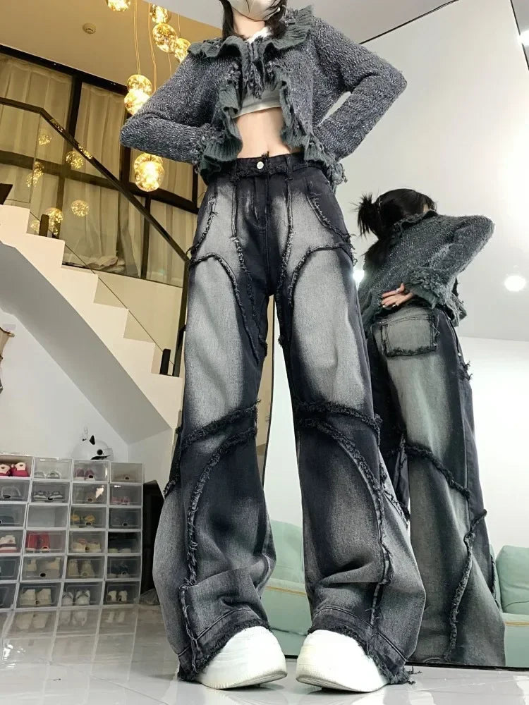 Discover the Y2K Wide Leg Jeans that combine boldness and comfort in a vintage hip-hop style. These high-waisted black jeans are perfect for women who want to stand out from the crowd. The loose baggy cut allows for freedom of movement while emphasizing a unique silhouette. The jeans are made from high-quality denim, offering both style and comfort. Ripped details and visible seams give the jeans a touch of character and evoke a timeless streetwear aesthetic. Pair them with a crop top for a casual look or wear them with an oversized jacket for a trendy and modern outfit. Elevate your alternative wardrobe with these statement pieces that capture the spirit of modern fashion while being easy to wear in everyday life. Get ready to attract all eyes on you and express your individuality confidently!