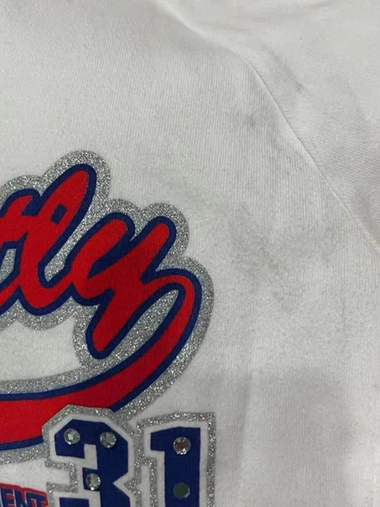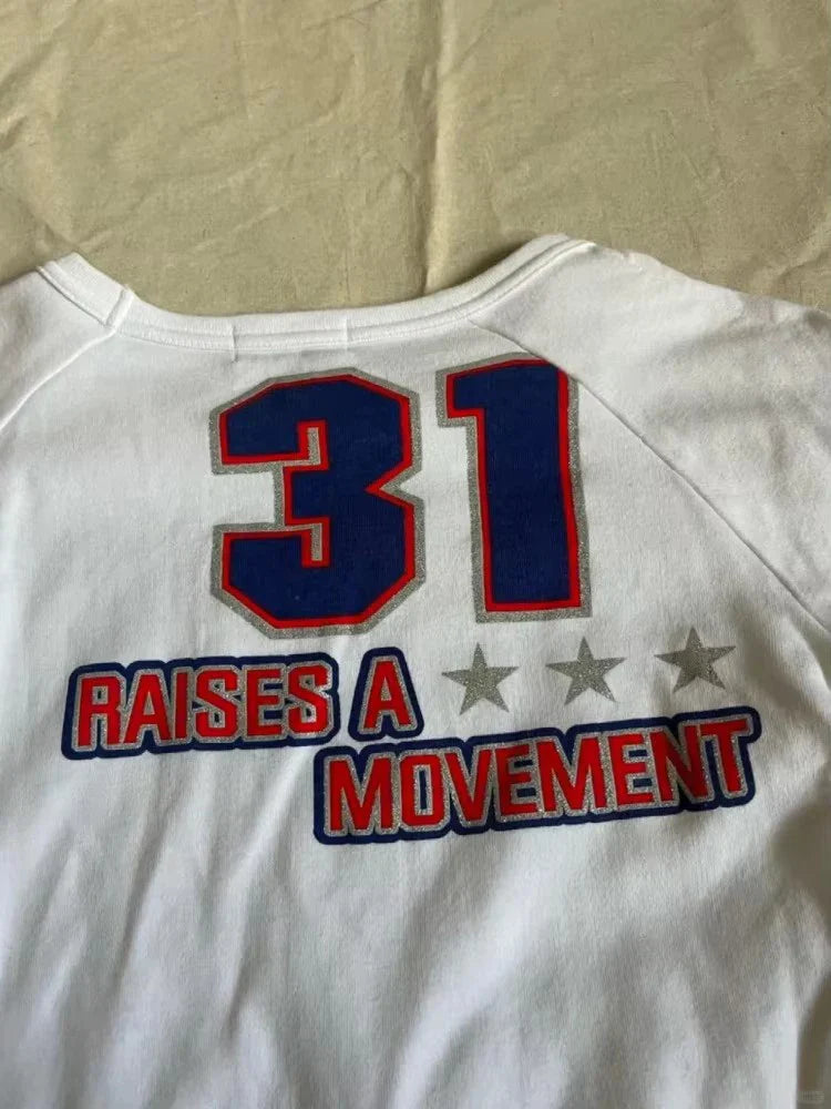 Dive into the world of alternative style with this long-sleeve T-shirt featuring white sleeves, an iconic piece inspired by the 2000s. The bold graphic pattern showcases the word "Perfectly" alongside bright red stars and the number "31," creating a nostalgic yet modern look that's perfect for expressing your unique personality. Made from a comfortable, lightweight fabric, this T-shirt fits perfectly to your figure while offering freedom of movement. The gathered details on the sides add a feminine touch while keeping it casual. Whether you pair it with a denim skirt or casual pants, this T-shirt is ideal for a trendy, laid-back Harajuku look. Complete it with chains and leather bags for an even stronger effect. Whether you're in the heart of the city or enjoying a relaxed day with friends, this grunge T-shirt suits any occasion. Let your creativity and individuality shine with this must-have for your alternative wardrobe!