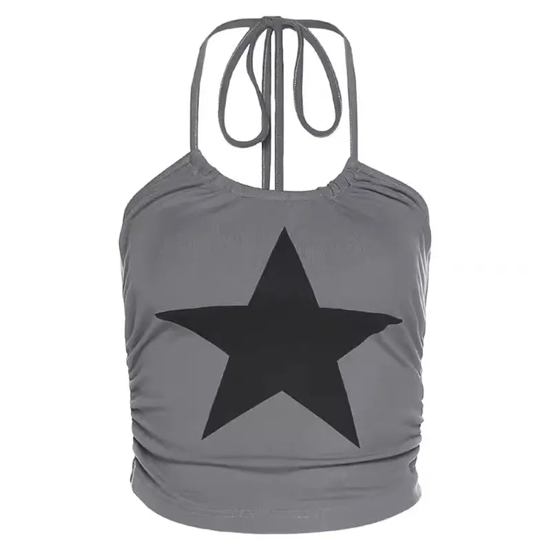Add a rebellious touch to your summer wardrobe with our Halter Backless Top featuring a star pattern - a must-have for those who like to stand out from the crowd. This sleeveless crop top made from a soft-feeling gray vintage fabric is a true style statement for a daring alternative look. Thanks to its unique design with a large black star boldly printed on the front, this top will quickly become one of your favorites for summer outings. The black beads add a touch of sophistication to the collar while providing a strong contrast to the soft gray of the fabric. The bandaged halter cut offers full freedom of movement and highlights your back, while the short, fitted style will surely excite fashion-conscious individuals looking for a chic, trendy piece. Pair it with high-waisted leather shorts like in the picture for a modern alternative look or with casual jeans for a relaxed style.