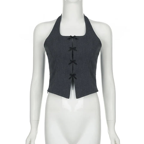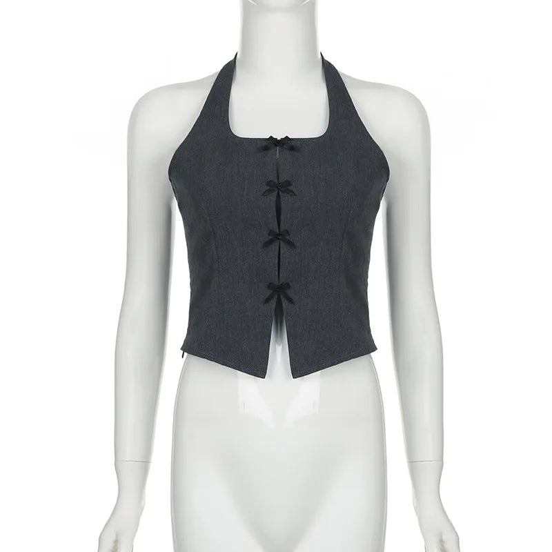 Reinvent your wardrobe with a bold piece from the early 2000s that is reborn in the modern era. Our gray sleeveless vest embodies the Y2K grunge style with a touch of sophistication. This top is designed to capture the essence of alternative chic and is a must-have for anyone daring enough to defy conventions. The fitted top is made from a soft, comfortable fabric and comes in a charcoal gray that reflects the urban and rebellious character of grunge. The front lacing with small ribbons adds a feminine and refined touch to the simple and clean cut. With a subtle slit at the front, this vest promises a provocative yet elegant look. Perfectly tailored to accentuate your curves, this vest features a stylish racerback and a crop top length that pairs wonderfully with high-waisted skirts or skinny jeans.
