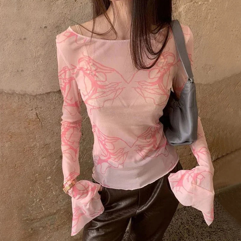 Dive into the world of Y2K with this absolutely trendy mesh top! This long-sleeve T-shirt is the perfect intersection of boldness and dreaminess, featuring a tie-dye design in delicate pink that invites nostalgic memories of the 2000s. Made from airy, transparent mesh fabric, it subtly hints without revealing, offering a seductive play with transparency while keeping your secrets. The fitted cut hugs your silhouette, while the open neckline highlights your headwear. This top is perfect for evenings with friends or music festivals and is a true enhancement to any alternative wardrobe that holds its own. The puffed sleeves add a touch of whimsy and promise to draw attention. Pair it with leather pants for a texture contrast or a high-waisted skirt to accentuate your silhouette.