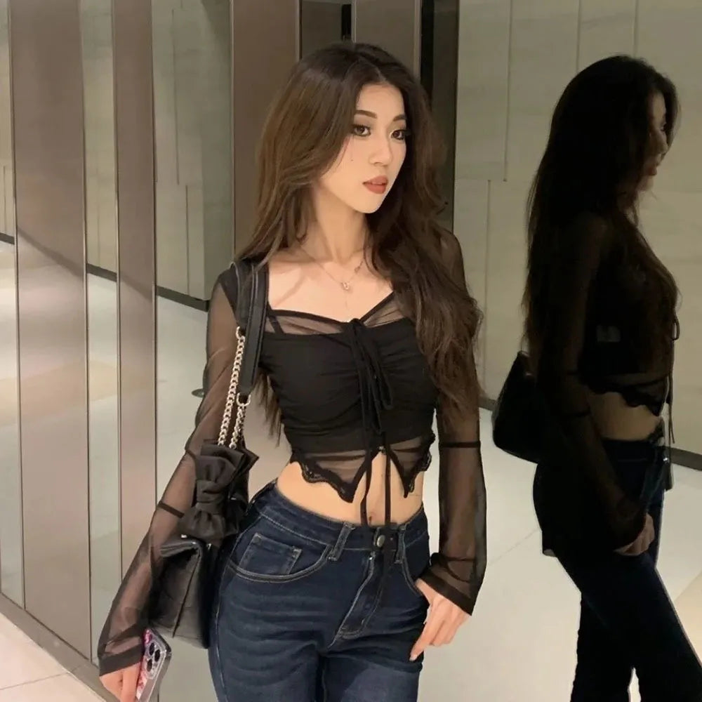 Discover the dynamic duo that captures the spirit of Y2K with modern elegance: Our fitted blouse and short top in red. The form-fitting silhouette and crop top style evoke a bygone era while boldly hugging the curves, adding a contemporary touch. The sensual blouse made of sheer red fabric showcases a daring romance with long, slender sleeves that demand attention and admiration. The delicately gathered fabric draws the eye to the bust, creating a play of texture that flatters your figure. Accented with a delicate lace trim at the hem, this piece effortlessly adds a dose of femininity to your wardrobe. The front closure with its neatly aligned buttons offers both function and style, allowing you to adjust your look as you please. Whether you're at the office or out in the city, this blouse with the integrated short top announces a sophisticated outfit that is sure to turn heads. Perfect for lovers of alternative fashion who desire a touch of sensuality in their daily attire, this blouse duo