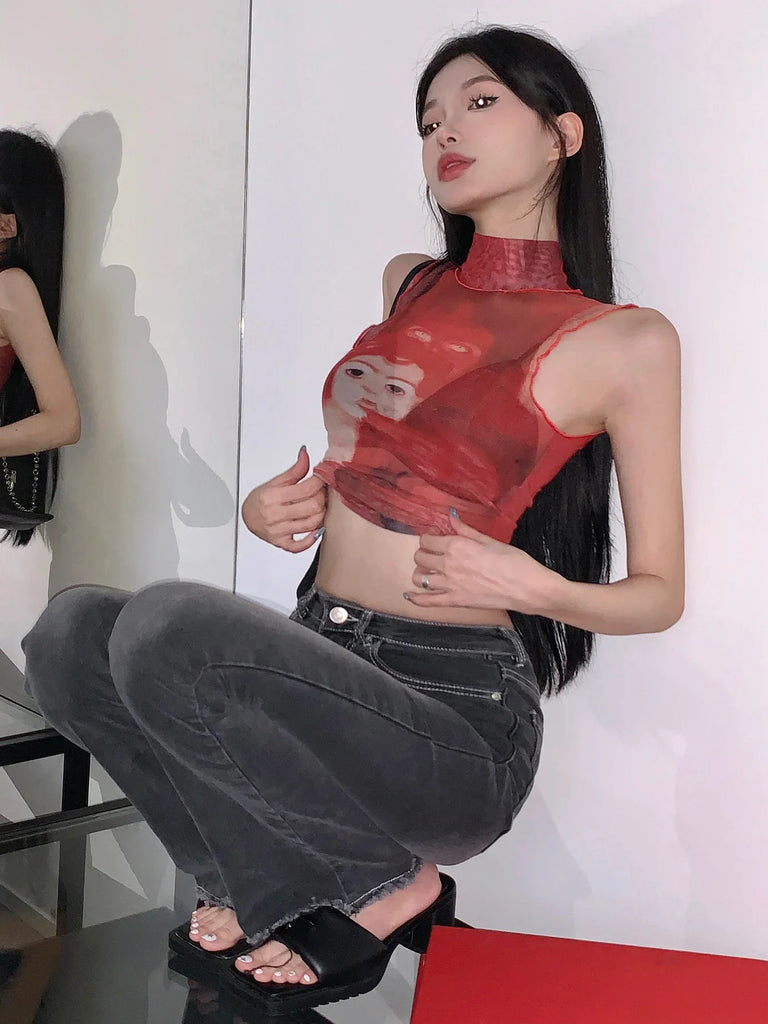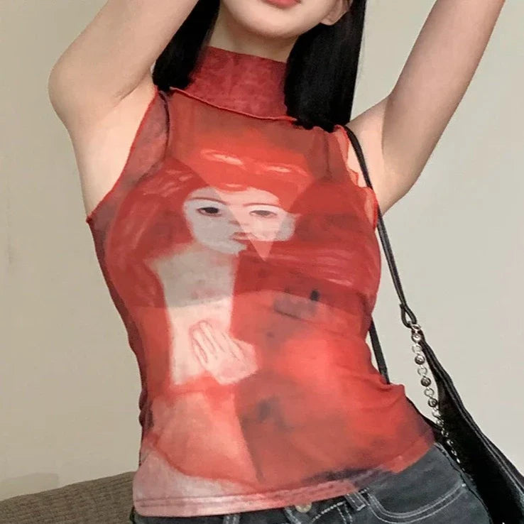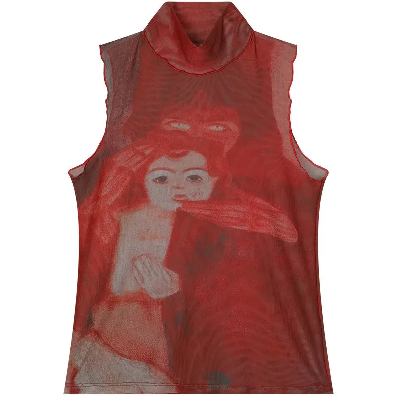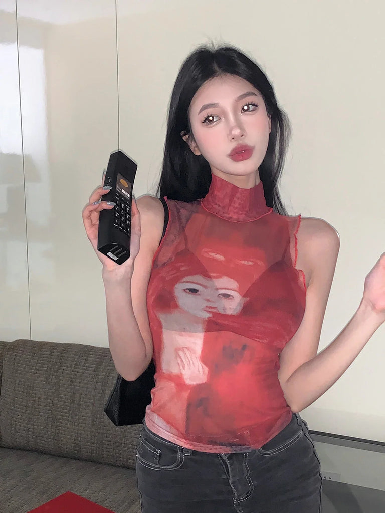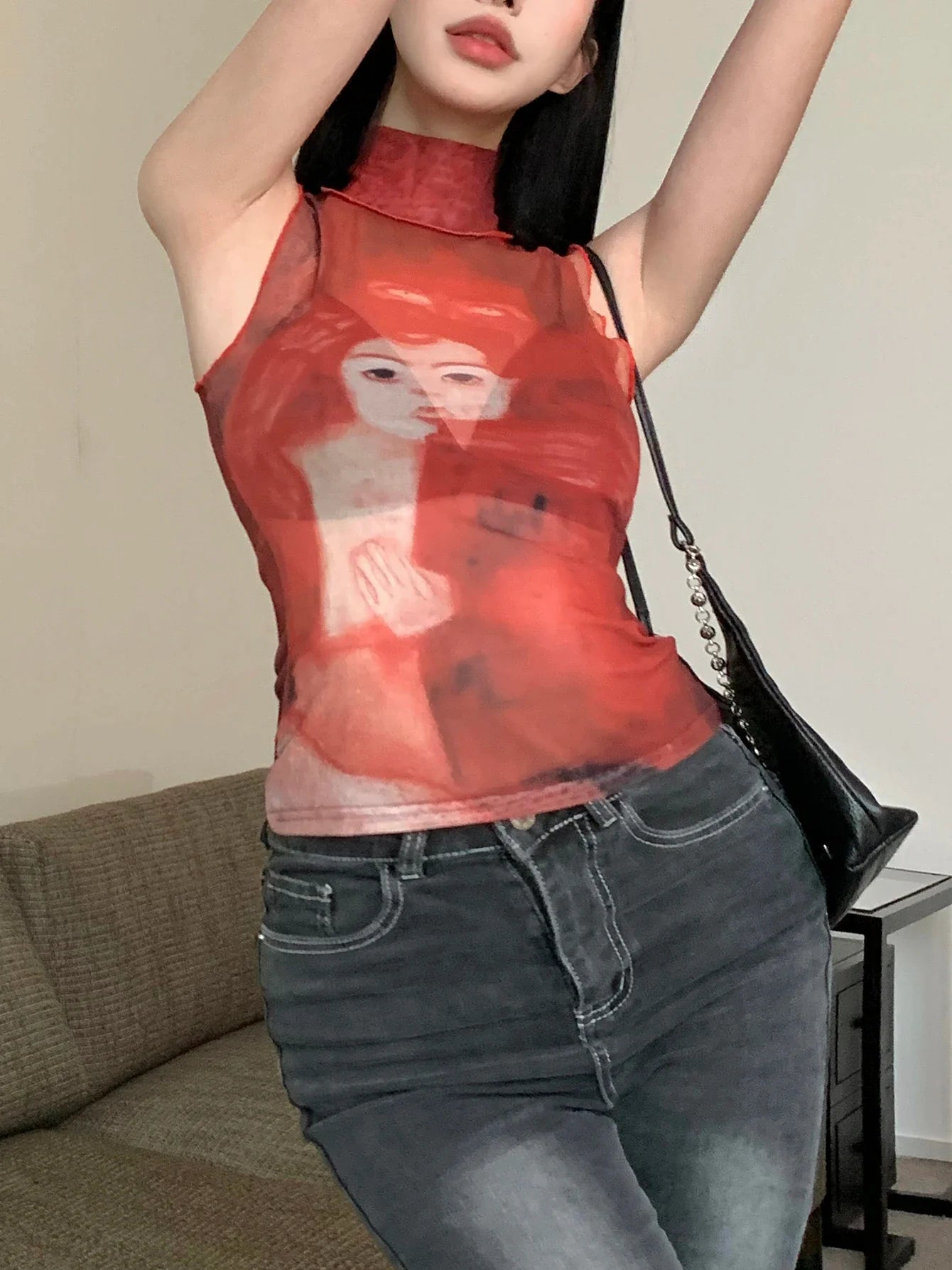 Immerse yourself in the nostalgia of the 2000s with this bold and artistic tube top crafted from knit, a true ode to the Y2K era. This sleeveless top is designed to capture the essence of individuality and underground style, symbolizing alternative fashion that turns established codes upside down. The transparent fabric allows the skin to peek through, creating a subtle play of seduction, while the striking print evokes abstract art with a hint of mystery. The stand-up collar adds a touch of sophistication and elegance to this garment, which pushes the boundaries between boldness and refinement. This lightweight, breathable knit top is perfect for warm days or layering over a basic T-shirt, instantly giving your wardrobe a touch of character. Pair it with high-waisted jeans for a casual look or a fitted black skirt for a polished appearance. This turtleneck knit top unites modern sensibility with retro influences and is a must-have for anyone daring to express their unique identity with power and pride. Wear it and emphasize your status as a pioneer of Y2K fashion.