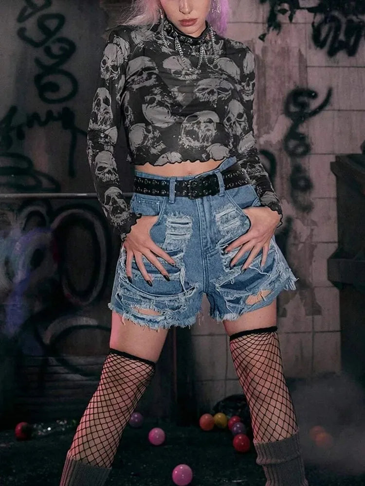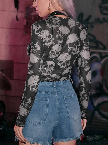 Immerse yourself in the world of the millennium with a touch of gothic boldness! This mysteriously transparent T-shirt, infused with skull prints, offers a perfect fusion of Y2K and Gothic styles. This captivating top is designed for women who dare to express their individuality and is sure to turn heads. With its veiled fabric hinting at the silhouette, it plays with sensuality while maintaining a rebellious and unconventional spirit. The skull motifs in shades of gray on a dark background evoke a dark elegance – perfect for anyone looking to add a touch of mystery to their wardrobe. The high collar and long sleeves provide a refined look, while the ripped details pay homage to the grunge roots of alternative fashion. This piece is versatile: Pair it with ripped denim shorts for a casual look or with form-fitting black pants for an evening appearance. Not just a statement piece