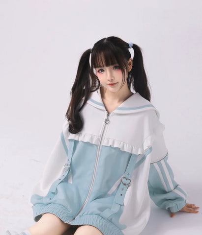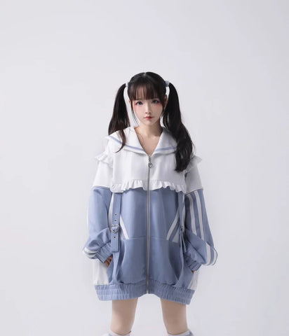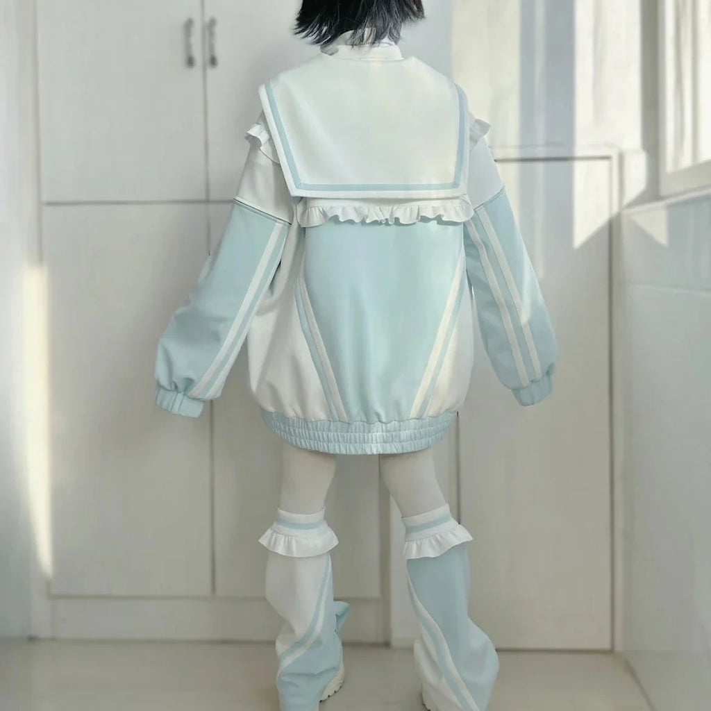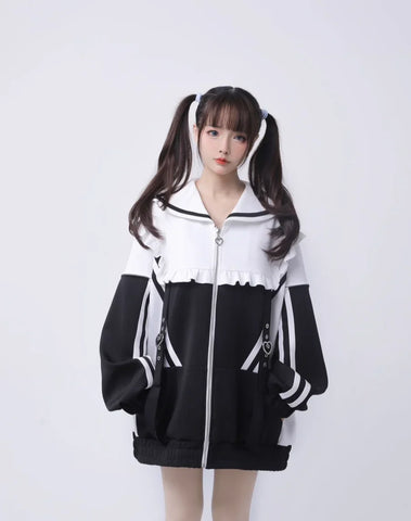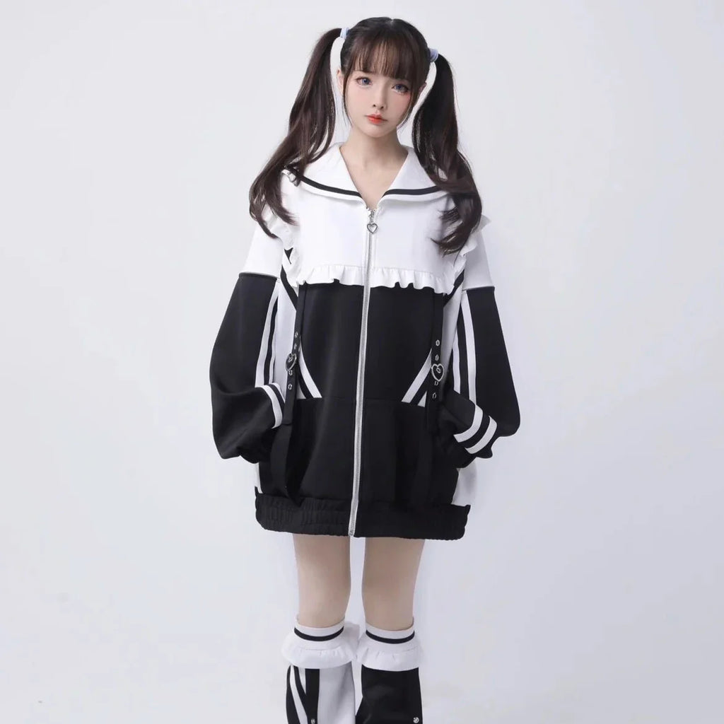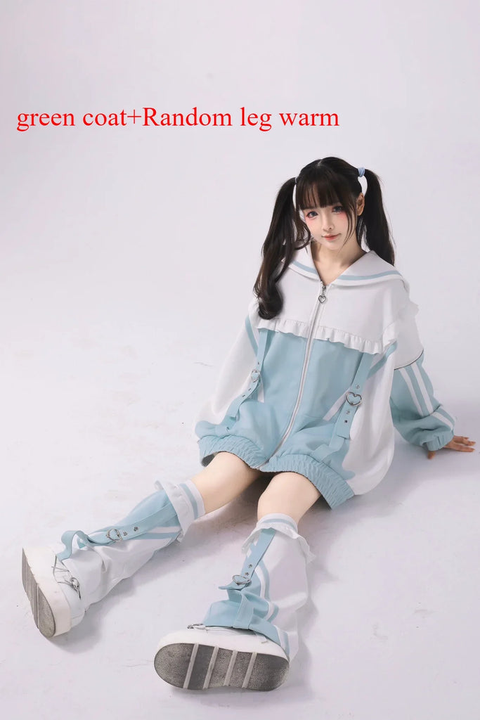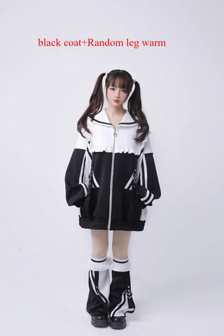 Dive into the captivating world of Japanese cyberpunk style with our Mine Y3K sweatshirt. This sailor-collared coat is designed for bold spirits and is as comfortable as it is iconic. With its long, wide sleeves and decorative zipper, it creates a casual silhouette while staying at the forefront of alternative fashion. The subtle hues of colored water and the striking contrast of black add an avant-garde touch, while fine details like the gathering at the collar emphasize its unique and trendy style. Together, the sweatshirt and leggings complement each other perfectly, creating an urban yet playful look. Be ready to stand out on the street with this chic and extravagant look while staying warm in the winter.