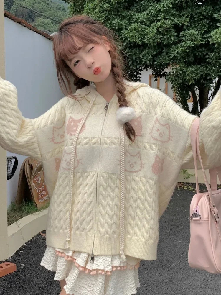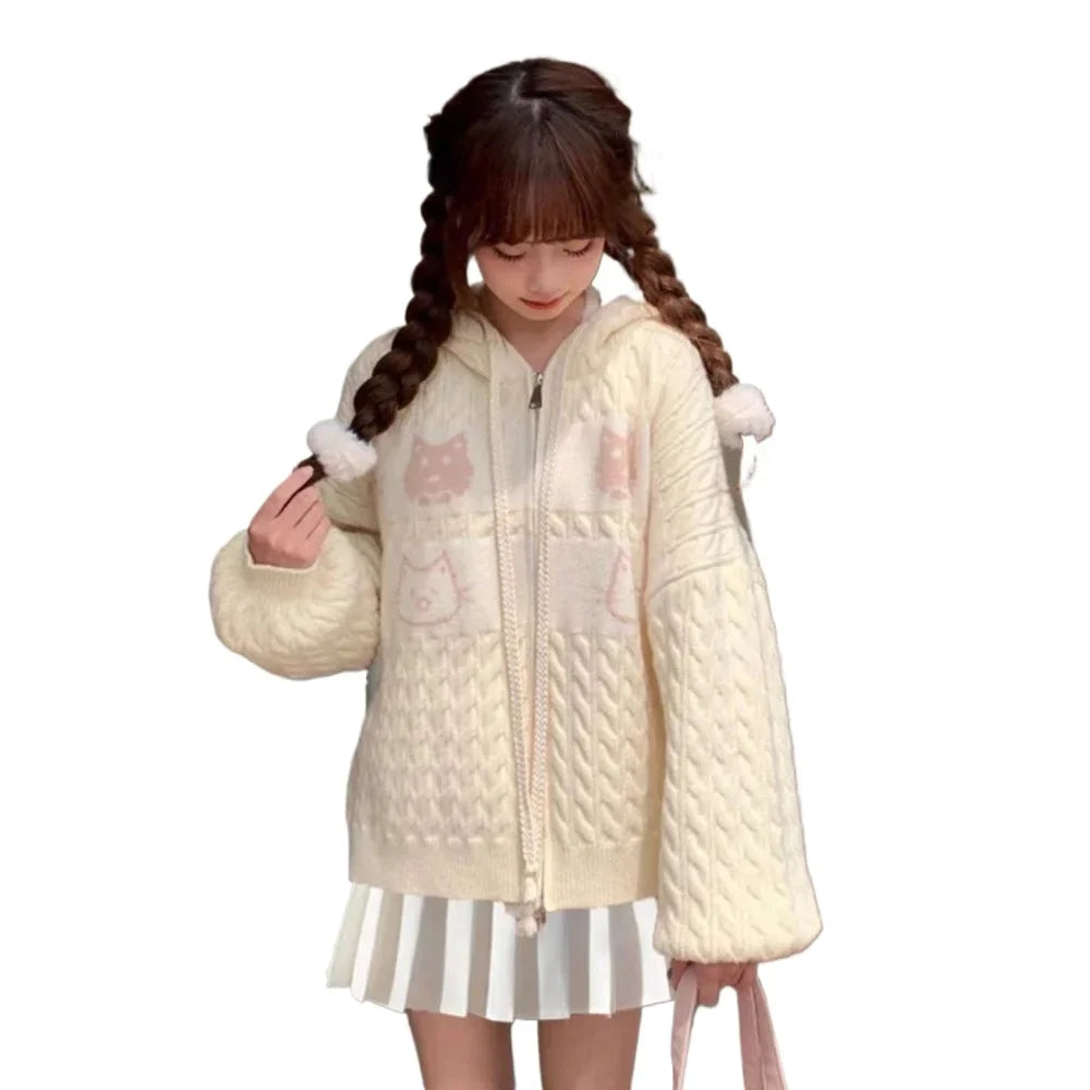 Discover our adorable Kawaii hooded vest, perfect for young girls looking for a cute yet comfortable style. The soft cream color and delicate cat motifs add a touch of innocence and freshness to any outfit. Made from soft, warming wool, this vest is ideal for a school day or a trip with friends. Featuring a convenient zipper and charming pom-poms on the sleeves, this model stands out with its unique design that combines comfort and trendiness. The textured knit adds a warm dimension while remaining lightweight, making it perfect for layering. Pair it with a pleated skirt for an irresistibly sweet look that will turn heads! Add this cardigan to your wardrobe and let your Kawaii style shine in everyday life.