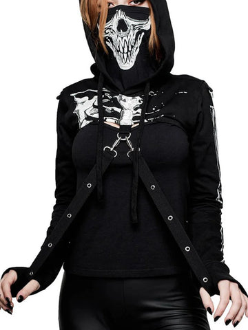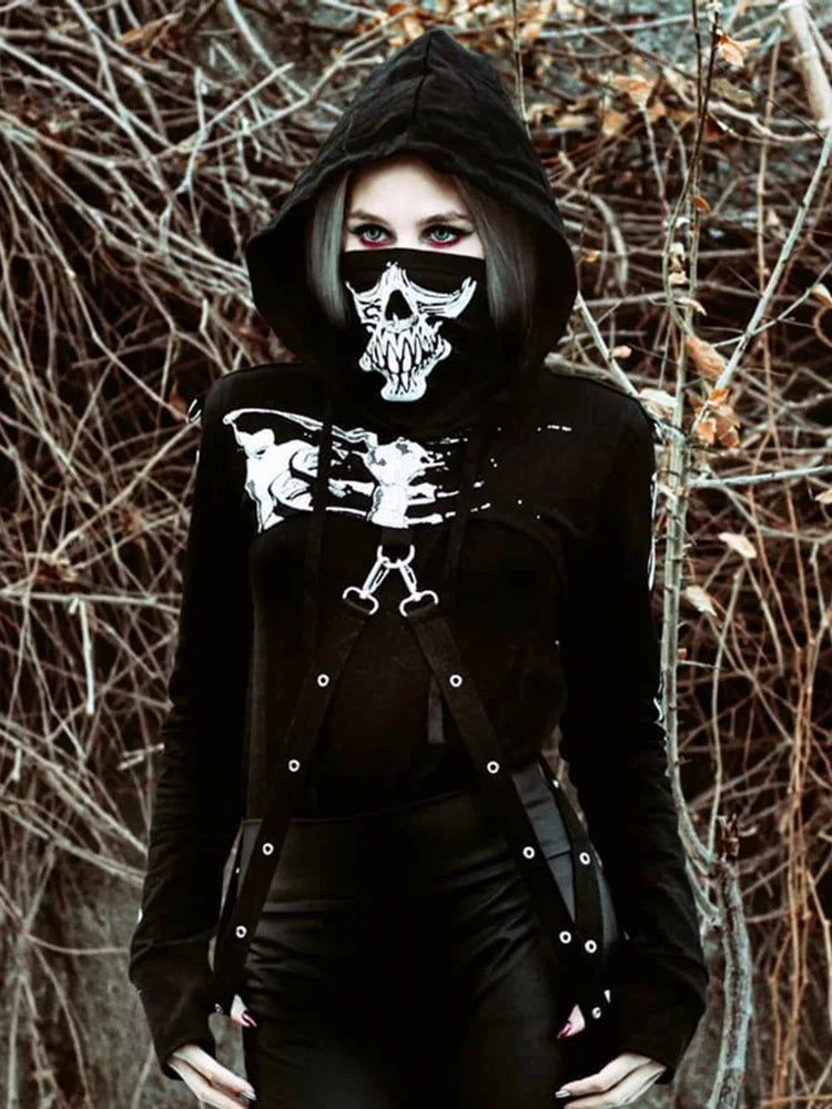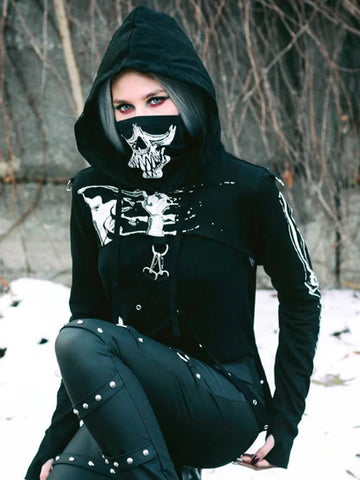 Discover the queen of the night within you with this Gothic punk hoodie with a daring design. This long-sleeved top is designed for women who aren’t afraid to show their wild and mysterious side, and it will elevate your rebellious wardrobe. This enchanting crop top features a white skeleton print that contrasts with a dark black background. Its strategic cutouts and crossed straps create a bold look that is at the forefront of the Gothic trend. With the avant-garde metal zipper, you can adjust the neckline as desired, while the delicate chains that brush the skin add a touch of rebellious sensuality. The high-quality fabric ensures comfort and durability, while the hood adds a mysterious element to your look. Whether you’re attending a concert or scouring the streets for nocturnal adventures, this crop top hoodie is the perfect ally for bold self-expression.