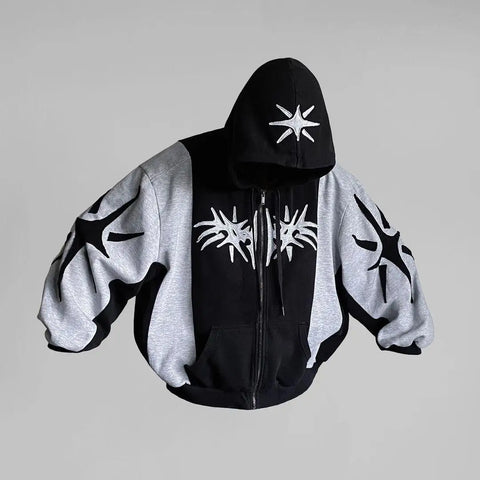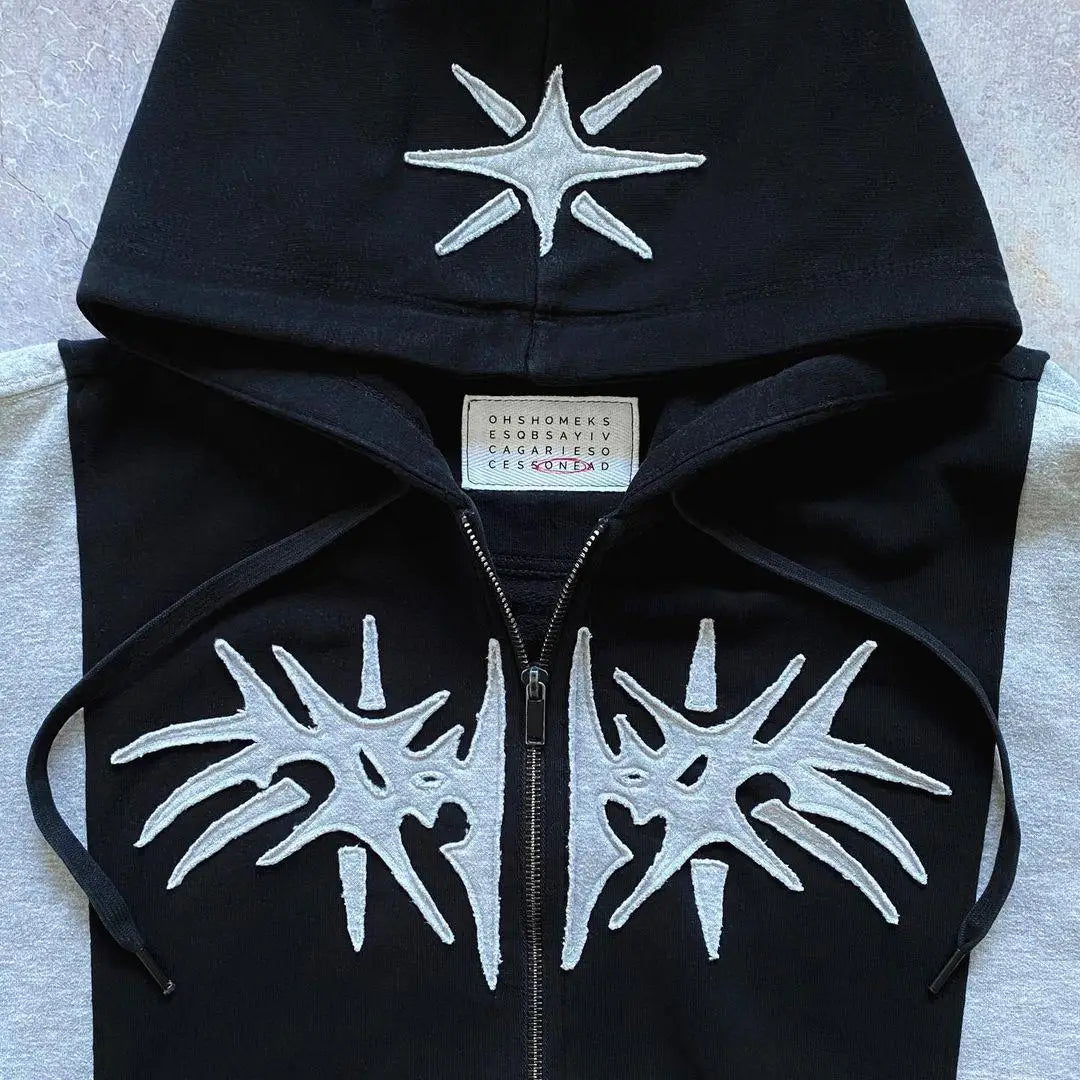 Discover the must-have for alternative wardrobes: the zip-up hoodie with a patchwork pattern in solid colors, inspired directly by the Y2K wave. A unisex piece that makes you the center of attention on the streets. The practical hood is adorned with a star symbol typical of the Y2K era, adding a mysterious accent and a gothic nuance to your look. The bold combination of deep black and bright gray creates a strong visual contrast, while the daring star patterns add a dynamic visual texture. The high-quality fabric ensures maximum comfort, providing warmth and softness for everyday wear. The spacious sleeves and relaxed fit guarantee you unmatched freedom of movement, whether you're in the city or relaxing at home. This hoodie is much more than just a piece of clothing; it is a statement; an anthem to nonconformity and self-expression. It is perfect for refining an urban hip-hop style or completing a chic casual outfit, proving versatile for any occasion. Do not hesitate to add this iconic piece to your collection and let your style tell the story of your originality.