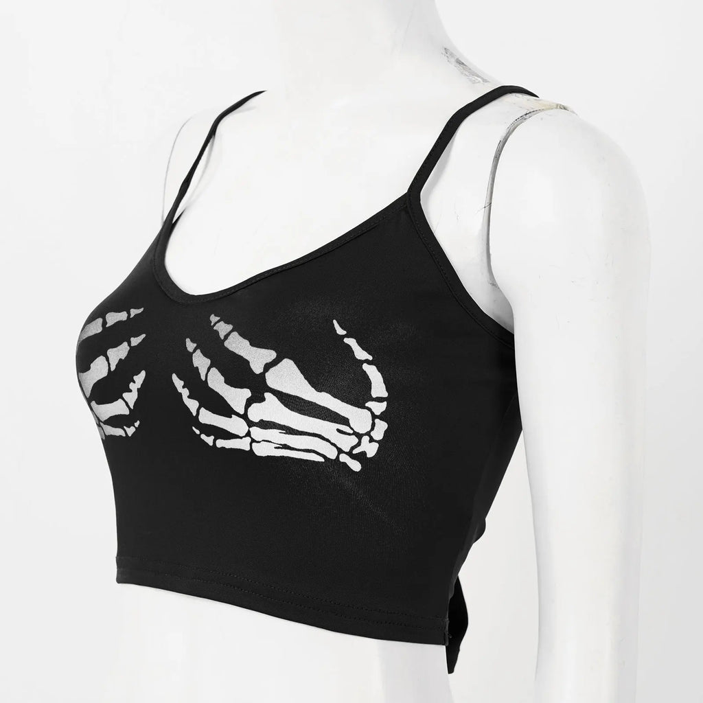 Show your rebellious side with this daring, sleeveless crop top, a must-have for all alternative fashion enthusiasts. The black top is a real eye-catcher with a bold white print of skeleton hands that seem to gently reach for your bust, creating a mysterious and striking look. This comfortable top, made from soft, stretchy material, hugs your curves while providing optimal freedom of movement. Whether you pair it with skinny jeans for a night out with friends or with leather shorts for a rock concert, it's guaranteed to be a highlight in your wardrobe. Make an original statement with this crop top that is sure to spark conversation, while also establishing yourself as a bold and independent style icon.