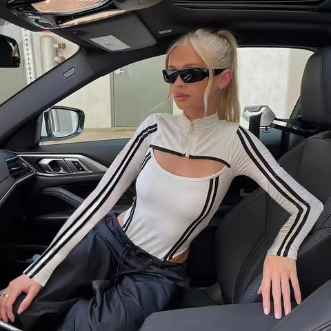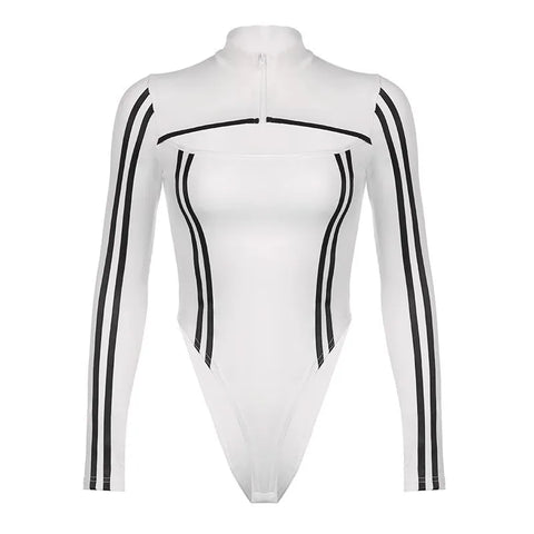 Dive into the cheeky egirl style with our sexy autumn bodysuit with long sleeves. Experience timelessness with an elaborate design that combines elegance and originality. Made from soft, stretchy fabric, this course set offers a modern, structured look. The strategically placed cutouts and the contrasting stripes in black and white accentuate the curves while providing a refined and chic appearance. The stand-up collar can be closed with an elegant zipper, but simultaneously showcases delicate skin, creating the perfect balance between sexy and sophisticated. Whether for a city stroll or a relaxed evening with friends, this bodysuit is an absolute must-have and elevates any outfit.