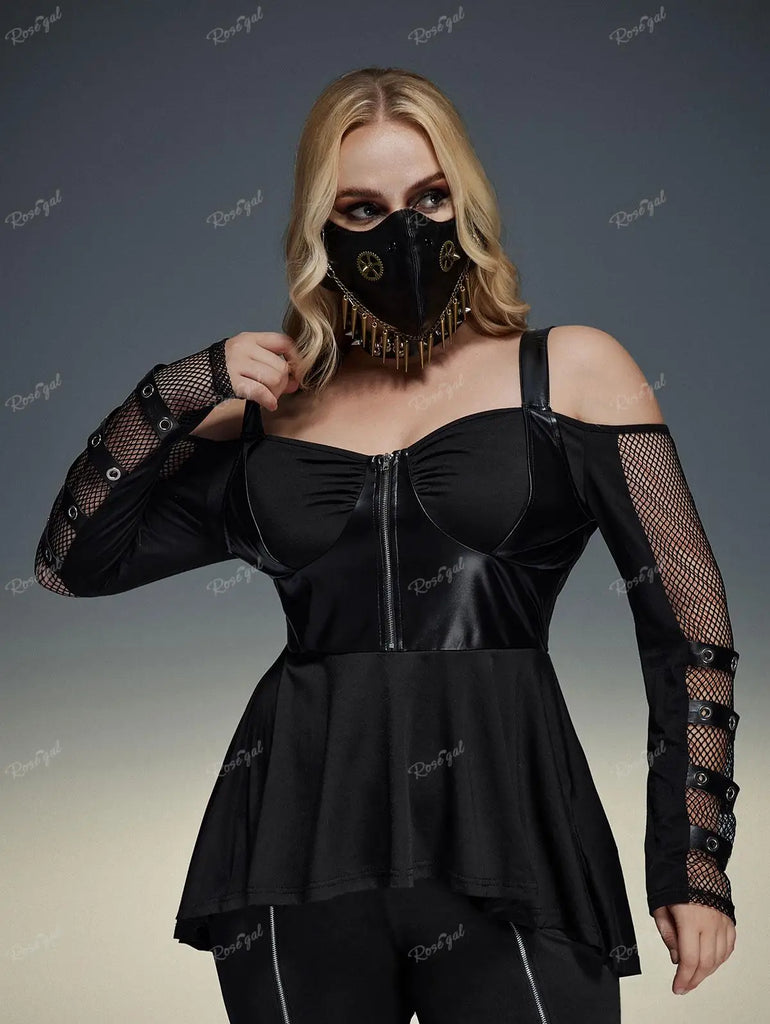 Immerse yourself in the dark and captivating world of alternative fashion with our black Gothic T-shirt. This top is designed for bold spirits, combining a distinctive aesthetic with unparalleled comfort. The blend of PU inserts and ruffled look creates a flattering silhouette, while the zipper at the front adds a practical yet stylish detail. The net sleeves bring a touch of daring and reveal just the right amount of skin to create a mysterious yet seductive look. Whether for an evening concert or a day out with friends, this Gothic T-shirt is the perfect choice to express your individuality. Dare to stand out from the crowd and let alternative style resonate with this essential piece in your wardrobe.
