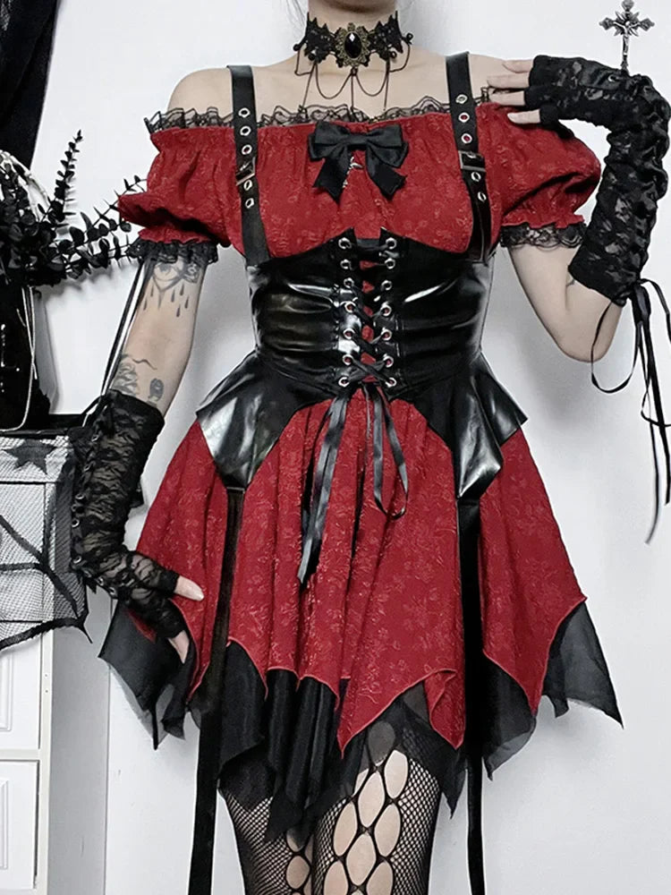 Gothic Dark Academia Dress for Women Red Fintion Faux Leather