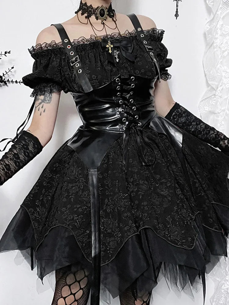 Immerse yourself in the world of Dark Academia with a remarkable Gothic touch. This Harajuku dress is like a modern fairy tale, captivating with its unique combination of deep red and intense black. It is crafted from a fabric reminiscent of the mysteries of ancient parties, featuring a black faux leather bodice with a corset lacing in the front to elegantly accentuate the waist. The square collar with lace and ruffles adds a hint of rebellious romance, while the asymmetrical, flowing skirt with overlapping tulle flounces creates a strong contrast. This dress is made for women who dare to break conventions and is perfect for streetwear events or poetic evenings. A subtle bow and a brooch with Gothic motifs complete the look with mysterious elegance.