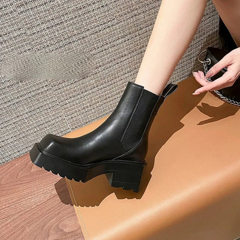 Discover the must-have of the season with these stylish black Chelsea boots that redefine alternative style. Crafted from genuine leather, these ankle boots epitomize comfort combined with a bold aesthetic. With a sleek silhouette and modern square toe, they are designed to stand out from the crowd. The chunky heel makes them more than just a pair of shoes - they are a style statement, perfect for confidently strolling down the streets or adding a rebellious touch to your daytime outfit. The side elastic gussets ensure easy on-and-off and a perfect fit, while the sturdy rubber sole promises long-lasting durability. Whether you're on your way to a rock concert or want to add a hint of boldness to your business attire, these Chelsea boots promise a look as unique as you are. Add them to your collection and make stylish statements.