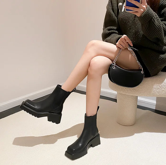 Chelsea Boots made of Leather with Chunky Heel for Women Square Toe