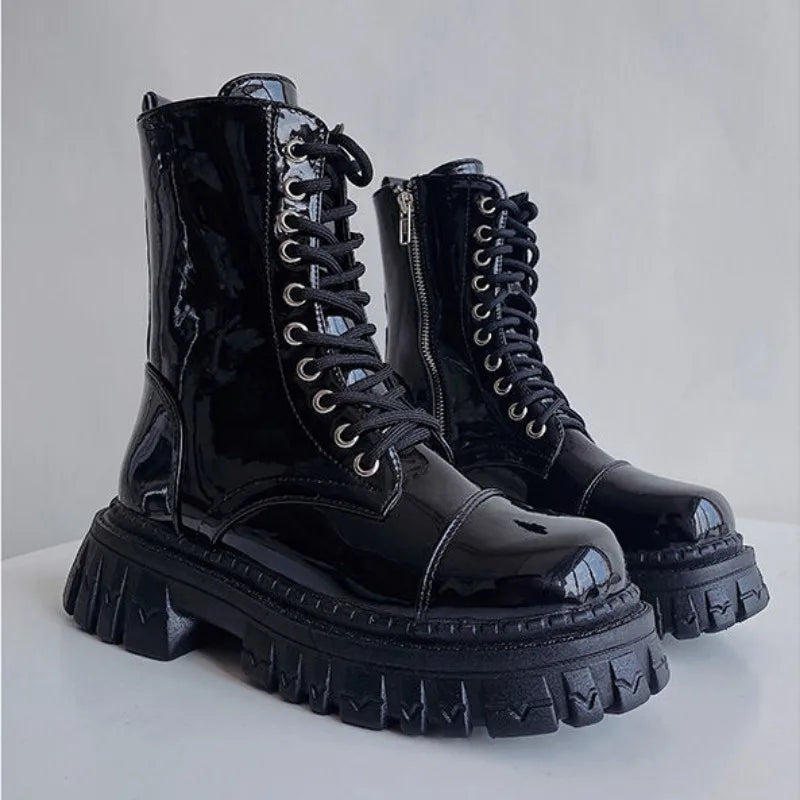 Dive into the world of alternative style with these Gothic biker boots that will enhance your wardrobe. The boots made of black patent leather are a real eye-catcher and offer unparalleled comfort. The sturdy laces and side zipper add a practical touch to the cheeky design. The thick, serrated sole is not only fashionable but also provides optimal grip and is perfect for a dynamic lifestyle. Whether strolling through the streets or heading to a concert, these ankle boots are the perfect choice to showcase your unique personality and attitude. Pair them with a knitted dress or ripped jeans for a rebellious and exciting look. Feet free!