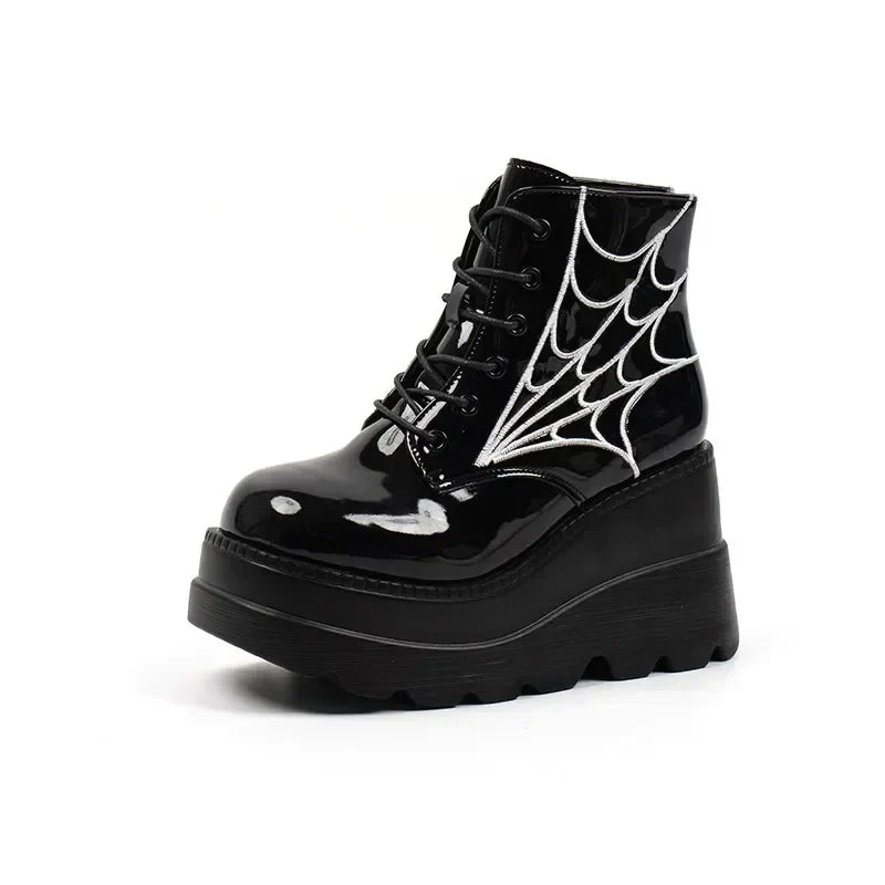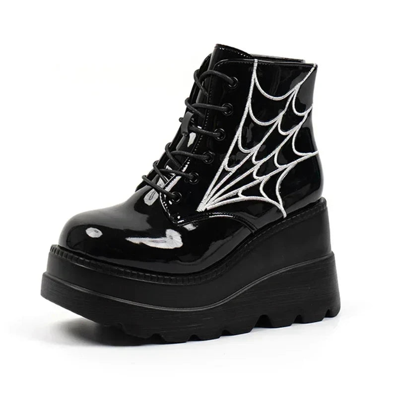 Enhance your alternative style with these stunning Gothic motorcycle boots. They are designed for a bold and mysterious look. The shiny black patent finish reflects light with every step, while the spider web print on the sides creates an exciting effect that is sure to attract all eyes. With an extra high heel and a thick sole, these boots combine comfort with style, making you stand out in any crowd. Practical laces provide an adjustable fit, while the sturdy design ensures durability and support. Whether for a party, a concert, or simply to emphasize your individuality in everyday life - these boots are for anyone who dares to tread new paths. Add a touch of mystery to your alternative wardrobe and let your feet do the talking!